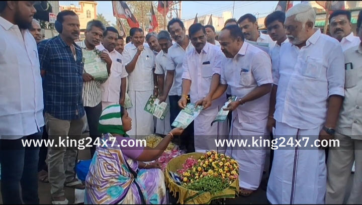 கரூரில் தேர்தலுக்கு தயாராகும் அதிமுகவினர். வியாபாரிகள், பொதுமக்களை சந்தித்து அதிமுக சாதனை விளக்க துண்டு பிரசுரம் வழங்கி பிரச்சாரம் செய்தனர்.
