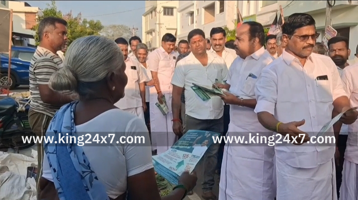 கரூரில் தேர்தலுக்கு தயாராகும் அதிமுகவினர். வியாபாரிகள், பொதுமக்களை சந்தித்து அதிமுக சாதனை விளக்க துண்டு பிரசுரம் வழங்கி பிரச்சாரம் செய்தனர்.;