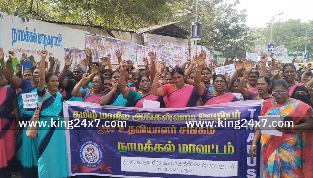 முன்னதாக, இந்த தொடர் காத்திருப்பு போராட்டத்தில் ஈடுபட்ட நாமக்கல் மாவட்டத்தை சேர்ந்த அங்கன்வாடி ஊழியர் மற்றும் உதவியாளர்கள் தங்கள் கோரிக்கைகளை வலியுறுத்தி கோஷங்கள் எழுப்பினர். சங்கத்தின் மாவட்டத் தலைவர் குர்ஷித் பேகம் தலைமை வகித்தார்.இதில், திமுக தேர்தல் வாக்குறுதி 313 நிறைவேற்றிடுக, காலி பணியிடங்களை உடனடியாக நிரப்புக, பணி நிரந்தரம் செய்திடுக என்பன உள்ளிட்ட 10 அம்ச கோரிக்கைகளை வலியுறுத்தி கோஷங்கள் எழுப்பினர் கோசங்கள் எழுப்பினர்.இதனைத் தொடர்ந்து நாமக்கல் பூங்கா சாலையில் இருந்து, போராட்டத்தில் ஈடுபட்ட மகளிர் பிரதான சாலையில் சென்று திடீர் சாலை மறியலில் ஈடுபட்டனர். அப்போது அங்கன்வாடி மைய பணியாளர்கள் சாலையில் படுத்து மறியல் போராட்டத்தில் ஈடுபட்டதால் பரபரப்பு ஏற்பட்டது. மேலும் மறியலில் ஈடுபட்ட பெண்களை காவல் துறையினர் தடுத்து நிறுத்தி, கைது செய்ய முயற்சித்தனர். அப்போது தள்ளுமுள்ளு ஏற்பட்டது.இதனைத் தொடர்ந்து அங்கன்வாடி மைய பணியாளர்கள் தங்கள் கோரிக்கைகளை மாநில அரசு நிறைவேற்ற வேண்டுமென கோரி சாலையில் அமர்ந்து சுமார் அரை மணி நேரத்திற்கும் மேலாக மறியலில் ஈடுபட்டனர். சுமார் அரை மணி நேரத்திற்கும் மேலாக போக்குவரத்து பாதிக்கப்பட்டது.இதனைத் தொடர்ந்து நாமக்கல் காவல் ஆய்வாளர் தலைமையில் பாதுகாப்பு பணியில் ஈடுபட்டிருந்த காவல் துறையினர் சாலை மறியலில் ஈடுபட்ட 300-க்கும் மேற்பட்ட அங்கன்வாடி மையப் பணியாளர்கள் மற்றும் உதவியாளர்களை கைது செய்து வாகனத்தில் ஏற்றிச் சென்று தனியார் திருமண மண்டபத்தில் தங்க வைத்தனர்.இந்த கோரிக்கை மறியல் போராட்டம் மற்றும் சாலை மறியல் ஆர்ப்பாட்டத்தினால் நாமக்கல் பிரதான சாலையில் பரபரப்பு ஏற்பட்டது.