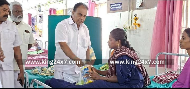 கரூர் மாவட்டம் குளித்தலை அருகே வை.புதூர் சாலையில் இரண்டு தனியார் பேருந்துகள் மோதிக் கொண்ட விபத்தில் 28 பேர் படுகாயம் அடைந்தனர். தற்போது குளித்தலை அரசு மாவட்ட தலைமை மருத்துவமனையில் சிகிச்சை பெற்று வரும் நபர்களை அதிமுக குளித்தலை கிழக்கு ஒன்றிய செயலாளர் கருணாகரன் தலைமையில் நிர்வாகிகள் நேரில் சென்று ஆறுதல் தெரிவித்து நிவாரண பொருட்கள் வழங்கினர். இதில் நிர்வாகிகள் பலரும் கலந்து கொண்டனர்.