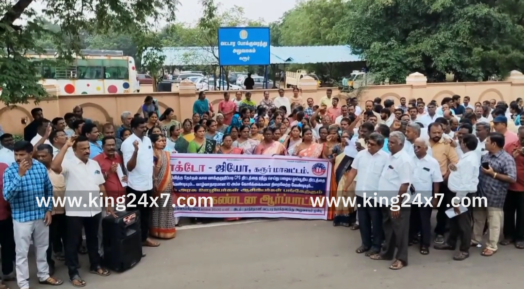 கரூரில் ஜாக்டோ ஜியோ சார்பில் 10 அம்ச கோரிக்கைகளை நிறைவேற்ற வலியுறுத்தி ஒரு நாள் தற்செயல் விடுப்பு எடுத்து ஆர்ப்பாட்டம். தமிழக அரசு அறிவித்த தேர்தல் கால வாக்குறுதிபடி சிபிஎஸ் திட்டத்தை ரத்து செய்து பழைய ஓய்வூதிய திட்டத்தை அறிவிக்க வேண்டிய பல்வேறு வாழ்வாதாரமான 10 அம்ச கோரிக்கை நிறைவேற்ற வலியுறுத்தி இன்று தமிழகம் முழுவதும் அரசு ஊழியர்கள் ஆசிரியர்கள் தற்செயல் ஒருநாள் விடுப்பு எடுத்து அடையாள வேலை நிறுத்த போராட்டத்தில் ஈடுபட்டனர். இதனைத் தொடர்ந்து கரூர் வட்டார போக்குவரத்து அலுவலகம் முன்பு ஜாக்டோ ஜியோ அமைப்பில் உள்ள தமிழ்நாடு அரசு ஊழியர் சங்க மாவட்ட தலைவர் அன்பழகன், தமிழ்நாடு ஆசிரியர் கூட்டணி மாநில பொருளாளர் பெரியசாமி,அரசு ஊழியர் சங்க மாவட்ட செயலாளர் ஜெயராம் ஆகியோர் தலைமையில் கோரிக்கைகளை வலியுறுத்தி ஆர்ப்பாட்டம் நடைபெற்றது. இந்த ஆர்ப்பாட்டத்தில் தமிழ்நாடு தொடக்க கல்வி ஆசிரியர் மன்ற மாவட்ட செயலாளர் வேலுமணி,தமிழ்நாடு இடைநிலை ஆசிரியர் சங்க மாவட்ட செயலாளர் ஆரோக்கிய பிரேம்குமார்,தமிழக ஆரம்ப பள்ளி ஆசிரியர் மாவட்ட செயலாளர் செல்வதுரை உள்ளிட்ட சங்க நிர்வாகிகள் மற்றும் அரசு ஊழியர்கள் ஆசிரியர்கள் என சுமார் 300க்கும் மேற்பட்டோர் கலந்து கொண்டு தங்களது கோரிக்கைகளை வலியுறுத்தி ஆர்ப்பாட்டத்தில் ஈடுபட்டனர். அப்போது கடந்த 2003-ம் ஆண்டுக்கு பிறகு அரசு பணியில் சேர்ந்தவர்களுக்கு தற்போது நடைமுறைப்படுத்தப்பட்டு வரும் பங்களிப்புடன் கூடிய ஓய்வூதிய திட்டத்தினை கைவிட்டு பழைய ஓய்வூதிய திட்டத்தினை அமுல்படுத்த வேண்டும். தொடக்க கல்வி துறையில் பணிபுரியும் 90% மேற்பட்ட ஆசிரியர்களுக்கு பாதிப்பினை ஏற்படுத்தியுள்ள அரசாணை 243 உடனடியாக ரத்து செய்ய வேண்டும். அரசின் பல்வேறு துறைகளில் 30 சதவீதத்திற்கும் மேலாக காலியாக உள்ள பணியிடங்களை நிரப்பி விடுவதற்கான நடவடிக்கைகளை உடனடியாக மேற்கொள்ள வேண்டும். 21 மாத ஊதிய மாற்ற நிலுவைத் தொகை ஆசிரியர்கள் அரசு ஊழியர்கள் அரசு பணியாளர்கள் ஆகியோருக்கு மறுக்கப்பட்டுள்ளதை வழங்கிட வேண்டும் உள்ளிட்ட 10- அம்ச கோரிக்கைகளை வலியுறுத்தி கோஷங்களை எழுப்பினர்.