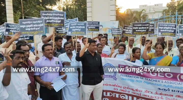 கரூரில் 10-அம்ச கோரிக்கைகளை வலியுறுத்தி போட்டோ-ஜியோ அமைப்பின் சார்பில் கோரிக்கை ஆர்ப்பாட்டம். தமிழ்நாடு அனைத்து அரசு அலுவலர்கள் ஆசிரியர்கள் மற்றும் உள்ளாட்சி பணியாளர்கள் அடங்கிய கூட்டமைப்பு ஆன போட்டோ- ஜியோ சார்பில் 10-அம்ச கோரிக்கைகளை வலியுறுத்தி நேற்று மாலை மாவட்ட ஆட்சியர் அலுவலகம் முன்பு தமிழ்நாடு அரசு ஊழியர் ஒன்றியத்தின் மாவட்டத் தலைவர் பாரதிதாசன், தமிழ்நாடு உயர்நிலை மேல்நிலை பள்ளி பட்டதாரி ஆசிரியர் சங்க மாநில செயலாளர் சந்திரசேகர், தமிழ்நாடு தொடக்கப்பள்ளி ஆசிரியர் கூட்டணியின் மாவட்ட செயலாளர் மணிகண்டன் ஆகியோர் தலைமையில் நடைபெற்ற இந்த கோரிக்கை ஆர்ப்பாட்டத்தில் நூற்றுக்கும் மேற்பட்ட பல்வேறு அரசு ஊழியர் சங்கத்தைச் சேர்ந்த நிர்வாகிகள் ஊழியர்கள் கலந்து கொண்டு தங்களது கோரிக்கையை வலியுறுத்தி ஆர்ப்பாட்டத்தில் ஈடுபட்டனர். அப்போது பங்களிப்பு ஓய்வூதிய திட்டத்தினை ரத்து செய்ய வலியுறுத்தியும், கருணை அடிப்படையில் 5% நியமனம் செய்யக்கூடாது என்பதை ரத்து செய்திட வலியுறுத்தியும், தலைமைச் செயலாகம் முதல் அனைத்து துறைகளிலும் உள்ள பல பிரிவு காலிப் பணியிடங்களை நிரப்பி, பதவி உயர்வு வழங்க வேண்டும் எனவும், அனைத்து அரசு அலுவலர்கள் ஆசிரியர்களுக்கு பழைய நிலையிலேயே உயர் கல்வி ஊக்க ஊதியம் வழங்க வேண்டும் எனவும், மாநில முன்னுரிமை எனக்கூறி வெளியிட்டுள்ள அரசாணை எண் 243 திருத்தம் செய்து மாவட்ட அளவில் முன்னுரிமை வழங்க வேண்டும் என்பது உள்ளிட்ட 10 அம்ச கோரிக்கைகளை வலியுறுத்தி ஆர்ப்பாட்டத்தில் ஈடுபட்டனர்.