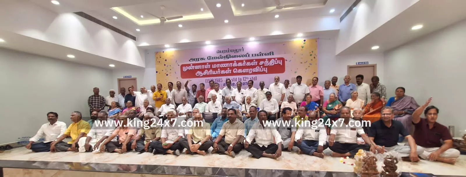 பெரம்பலூர் அரசு மேல்நிலைப் பள்ளியில் 1978 ஆம் ஆண்டு முதல் 1983 ஆம் வரை படித்த முன்னாள் மாணவர்கள் 100 பேர் சுமார் 43 ஆண்டுகளுக்கு பிறகு ஒன்று சேர்ந்து தங்கள் படித்த பள்ளிக்கு மேசை,நாற்காலிகள் வழங்கி, தங்களுக்கு பாடம் கற்பித்த ஆசிரியர்களுக்கு மரியாதை செலுத்தினார்கள்! கர்நாடக காவல்துறை ஏ.டி.ஜி.பி.ஹரிசேகர் உள்ளிட்டோர் கலந்து கொண்டனர். பெரம்பலூர் அரசு மேல்நிலைப் பள்ளியில் கடந்த 1978 ஆம் ஆண்டு முதல் 1983 ஆம் வரை படித்த, முன்னாள் மாணவர்கள் 100 பேர் சுமார் 43 ஆண்டுகளுக்கு பிறகு ஒன்று சேர்ந்து தங்கள் படித்த பள்ளிக்கு மேசை,நாற்காலிகள் வழங்கி, தங்களுக்கு பாடம் கற்பித்த ஆசிரியர்களுக்கு மரியாதை செலுத்தினார்கள். கர்நாடக காவல்துறை ஏ.டி.ஜி.பி.ஹரிசேகர் உள்ளிட்ட பழைய மாணவர்களை 3 வருடங்களாக தங்களுடன் படித்தவர்களை கண்டுபிடித்து, அவர்களை ஒன்று சேர்த்து இந்த நிகழ்ச்சி நடைபெற்றது. இன்று காலை அவர்கள் படித்த பள்ளியான பெரம்பலூர் அரசு மேல்நிலைப்பள்ளிக்கு மேசை,நாற்காலிகள் வழங்கினார்கள். அதன்பிறகு தனியார் திருமண மண்டபத்தில் நடைபெற்ற நிகழ்ச்சியில், தங்களுக்கு பாடம் கற்பித்த ஆசிரியர்களுக்கு மரியாதை செய்யும் வகையில் ஆசிரியர்கள் 20 பேருக்கு பொன்னாடை அணிவித்து கெளரவிக்கப்பட்டது. 43 வருடங்களுக்கு பிறகு அவர்கள் ஒன்று சேர்ந்து நடத்திய இந்த நிகழ்ச்சி அவர்களுக்குள் ஆனந்த கண்ணீருடன் மிகுந்த மகிழ்ச்சியை ஏற்படுத்தியது.