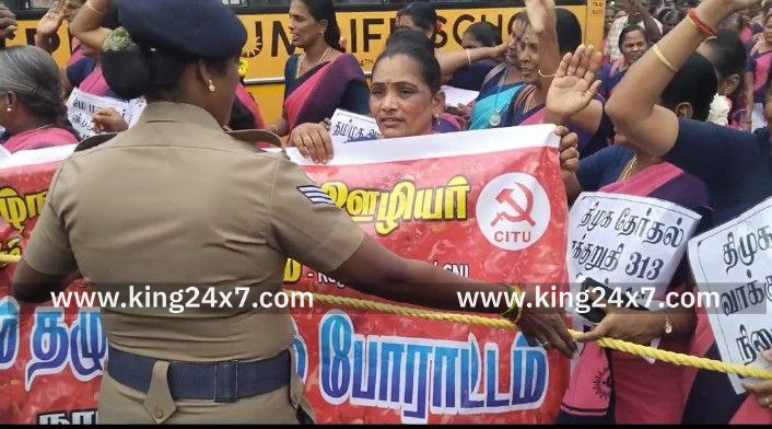 திமுக அறிவித்த தேர்தல் வாக்குறுதி 313 ஐ நிறைவேற்றிடக்கோரி நாமக்கல்லில் சாலை மறியல் போராட்டத்தில் ஈடுபட முயன்ற அங்கன்வாடி ஊழியர், உதவியாளர்கள் 1000 பேர் கைது செய்யப்பட்டனர்.