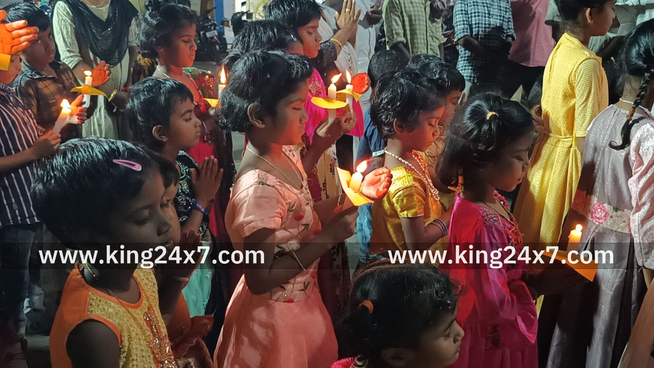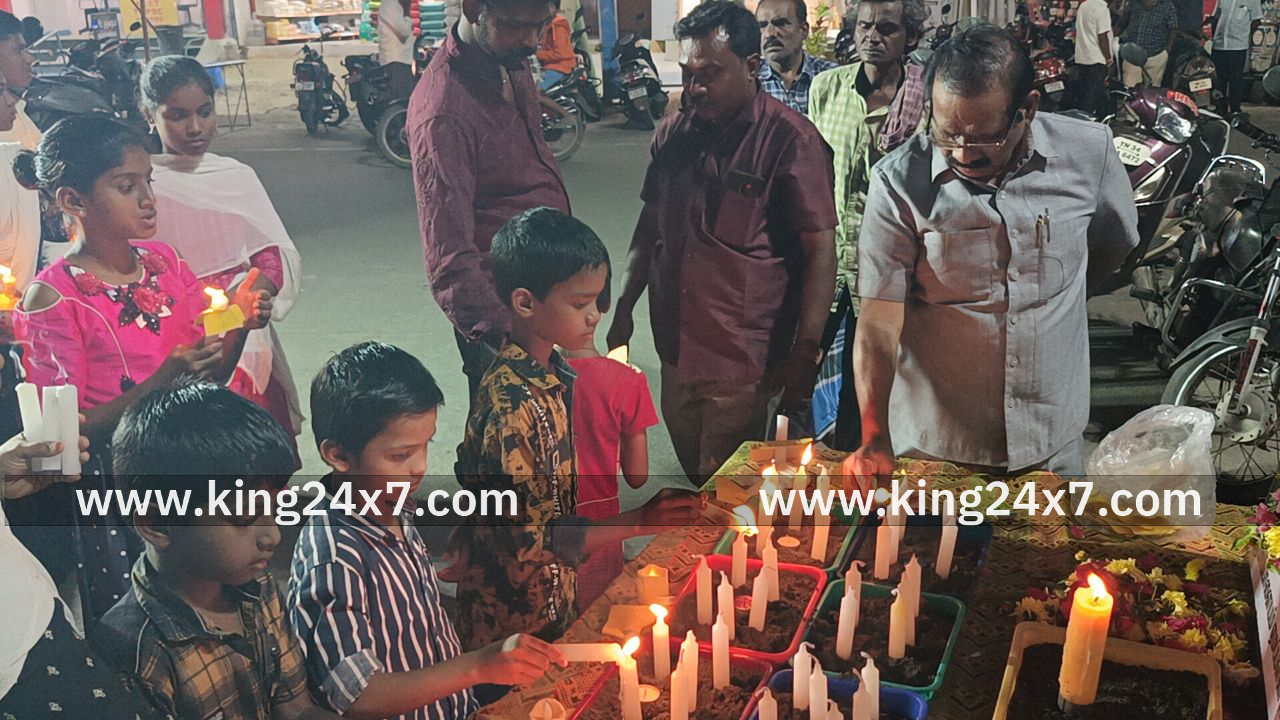 கரூரில் கடந்த 27ஆம் தேதி நடந்த கூட்டத்தின் போது நெரிசலில் சிக்கி உயிரிழந்த 41 பேரின் ஆன்மா சாந்தி அடையவும் அவர்களது குடும்பத்திற்கு ஆறுதல் தெரிவிக்கும் வகையிலும் நாமக்கல் மாவட்டம் திருச்செங்கோடு பராமரிக்கும் கரங்கள் இல்ல ஆதரவற்ற குழந்தைகள் 30 பேர்மெழுகுவர்த்தி ஏற்றி கண்ணீர்அஞ்சலி செலுத்தினர்;