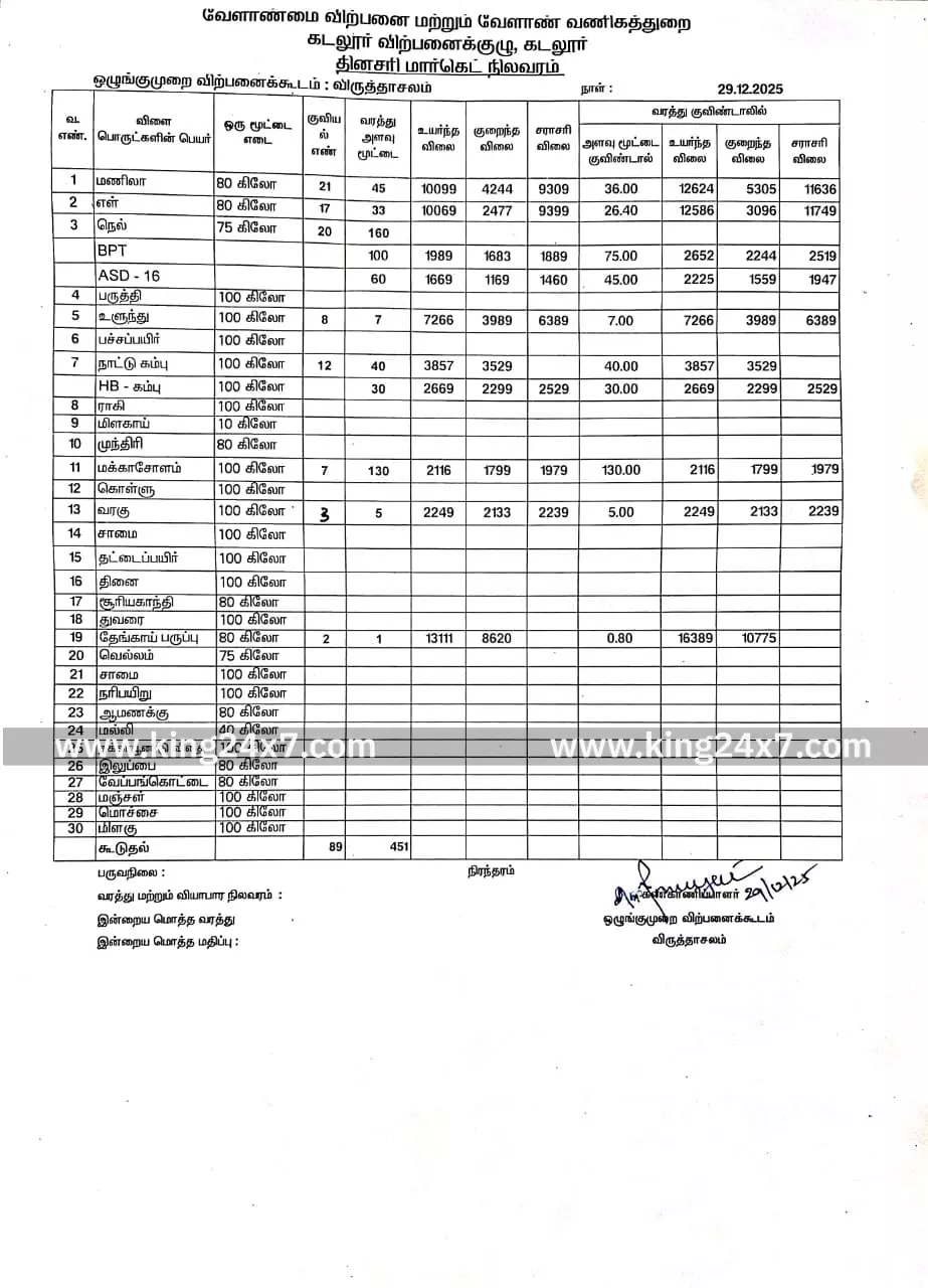 விருத்தாசலம் ஒழுங்குமுறை விற்பனைக் கூடத்தில் இன்று (டிச. 29) மணிலா வரத்து 45 மூட்டை, எள் வரத்து 33 மூட்டை, நெல் வரத்து 160 மூட்டை, உளுந்து வரத்து 7 மூட்டை, நாட்டு கம்பு வரத்து 40 மூட்டை, HPகம்பு வரத்து 30 மூட்டை, மக்காச்சோளம் வரத்து 130 மூட்டை, வரகு வரத்து 5 மூட்டை, தேங்காய் பருப்பு வரத்து 1 மூட்டை என மொத்தம் 451 மூட்டை வந்துள்ளது.