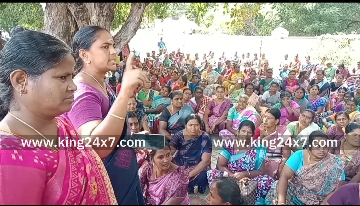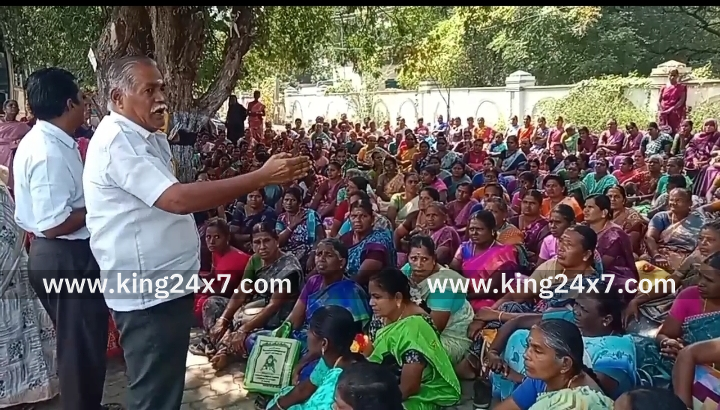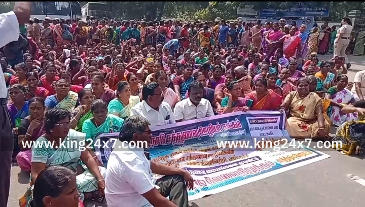 கரூரில், திமுக தேர்தல் வாக்குறுதியை நிறைவேற்ற கோரி 500 க்கும் மேற்ப்பட்ட சத்துணவு ஊழியர்கள் சாலை மறியல் போராட்டம் நடத்தியதால் கைது.