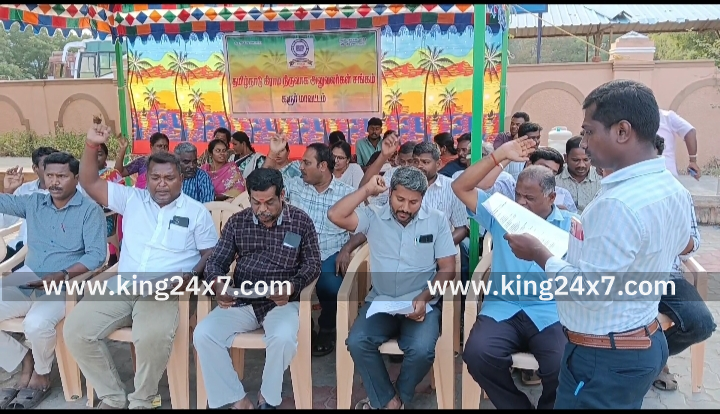 கரூரில் 7 அம்ச கோரிக்கைகளை வலியுறுத்தி கிராம நிர்வாக அலுவலர்கள் காத்திருப்பு போராட்டம். தமிழ்நாடு கிராம நிர்வாக அலுவலர்கள் சங்கம் சார்பில் தமிழக முழுவதும் 7 அம்ச கோரிக்கை வலியுறுத்தி மாவட்ட தலைநகரங்களில் காத்திருப்பு போராட்டத்தில் ஈடுபட்டனர். இதனை தொடர்ந்து கரூர் வட்டார போக்குவரத்து அலுவலகம் அருகில் சங்கத்தின் மாவட்டத் தலைவர் முருகேசன் தலைமையில் காத்திருப்பு போராட்டம் நடைபெற்றது. இந்த போராட்டத்தில் மாவட்ட செயலாளர் பிரபு, மாவட்ட துணை தலைவர் முத்துக்குமார், மாவட்ட ஒருங்கிணைப்பாளர் மோகன்ராஜ், மாவட்ட பொருளாளர் ராஜ்கமல் உள்ளிட்ட இருபால் கிராம நிர்வாக அலுவலர்கள் 50க்கும் மேற்பட்டோர் கலந்து கொண்டு காத்திருப்பு போராட்டத்தில் ஈடுபட்டனர். அப்போது கிராம நிர்வாக அலுவலகத்தில் கழிப்பறை, குடிநீர், இணைய வசதியுடன் கூடிய நவீனமயமாக்கம் செய்யப்பட வேண்டும் எனவும், கிராம நிர்வாக அலுவலர்களின் டிஎன் பிஎஸ்சி நேரடி நியமன முறையில் கல்வி தகுதியை பட்டப் படிப்பு என மாற்றியமைக்க வேண்டும், பதவி உயர்வு என்பது எட்டாக்கனியாகவே உள்ள நிலையில் பத்தாண்டு பணி முடித்தவர்களுக்கு தேர்வுநிலை கிராம நிர்வாக அலுவலர் எனவும்,20 ஆண்டு படி முடித்த கிராம நிர்வாக அலுவலர்களுக்கு சிறப்பு நிலை கிராம நிர்வாக அலுவலர் என பெயர் மாற்றம் செய்து அரசாணை வெளியிட வேண்டும், டி எஸ் எல் ஆர் பட்டா மாறுதலில் கிராம நிர்வாக அலுவலர்களின் பரிந்துரை பெற வருவாய் மற்றும் பேரிடர் மேலாண்மை துறை முதன்மை செயலாளர் உத்தரவு பிறப்பிக்கப்பட்டும் இதனால் வரை நடைமுறைப்படுத்தாமல் இருப்பதை உடனடியாக நடைமுறைப்படுத்த வேண்டும், அரசு ஊழியர்களுக்கு மீண்டும் பழைய பென்ஷன் திட்டத்தை அமல்படுத்த வேண்டும் உள்ளிட்ட கோரிக்கைகளை வலியுறுத்தி கோஷங்களை எழுப்பினர்.