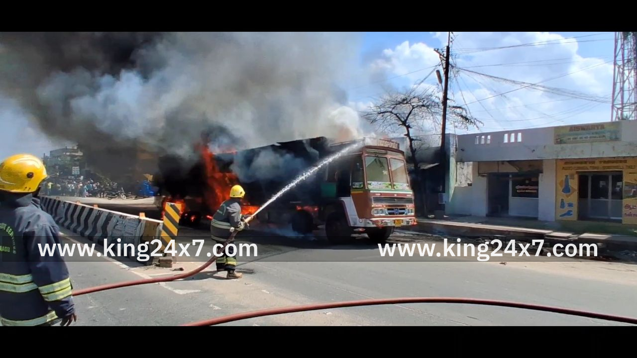 திருச்செங்கோடு ஒருங்கிணைந்த நீதிமன்ற வளாகம் எதிரில் திருச்செங்கோடு லாரி உரிமையாளர்கள் சங்கம் பெட்ரோல் பங்குக்கும் எதிரில் கேரளாவில் இருந்து வந்து நின்று கொண்டிருந்தஹைதராபாத் செல்லஇருந்த டிப்பர் லோடு ஏற்றி வந்த 12 சக்கரம் கொண்ட அசோக் லேலண்ட் டாரஸ் லாரியில் டயர் வெடித்து டீசல் டேங்கில் தீப்பிடித்து திடீர் விபத்து கொளுந்து விட்டு எறிந்த தீயில் லாரி முற்றிலும் எரிந்து சேதம் கொழுந்து விட்டு எரிந்த லாரி டயர்கள் வெடித்ததால் பயங்கர சத்தம்ரோட்டில் ஓரம் இருந்த கடைகள் லாரியின் அருகில் நிறுத்தப் பட்டிருந்த இருசக்கர வாகனங்கள் எரிந்து சேதம் பெட்ரோல் பங்க் அருகில் இருந்ததால் பரபரப்பு திருச்செங்கோட்டில் இருந்து இரண்டு தீயணைப்பு வாகனங்கள் வெப்படையில் இருந்து ஒரு தீயணைப்பு வாகனம் என மூன்று தீயணைப்பு வாகனங்கள் வந்து வேகமாக தீயை அணைத்தனர் சம்பவம் குறித்து திருச்செங்கோடு நகர போலீசார் விசாரணைஇந்த விபத்தில் லாரி மரம் அருகே இருந்த கடைகள் இருசக்கர வாகனங்கள் என சுமார் 50 லட்சத்திற்கும் மேற்பட்ட பொருள்கள் எரிந்து சேதமானது* கேரளாவில் இருந்து டிப்பர் லோடு ஏற்றிக்கொண்டு ஹைதராபாத் செல்ல திருச்செங்கோடுசெங்கோடம் பாளையத்தைச் சேர்ந்தசிதம்பரம் என்பவரதுமகன் மகேந்திரனுக்குசொந்தமான 12 டயர்கள் கொண்ட அசோக் லேலண்ட் டாரஸ் லாரியை பாலருகேட் பகுதியைச் சேர்ந்த நாகராஜ் 45 என்ற ஓட்டுநர் ஓட்டி வந்துள்ளார் லாரியில் சிதம்பரமும் உடன் பயணித்துள்ளார்.வரும் வழியில் திருச்செங்கோடுசங்ககிரி ரோட்டில் ஒருங்கிணைந்த நீதிமன்ற வளாகம் அருகில் உள்ள திருச்செங்கோடு லாரி உரிமையாளர்கள் சங்க பெட்ரோல் பங்கில் டீசல் அடிப்பதற்காக வண்டியை ஓரம் கட்டி நிறுத்திவிட்டு டிரைவர் கீழே இறங்கிய சமயத்தில் திடீரென நடுப்பக்க டயர்கள் வெடித்து டீசல் டேங்க் தாக்கப்பட்டு டீசல் டேங்கில் இருந்து திடீர் தீ எழுந்து குரூப்பு நிறுவன பரவ தொடங்கியது டயர்கள் வெடிக்க தொடங்கியவுடன் அருகில் இருந்த கடைகளின் சட்டங்களில் உயர் காற்றழுத்த மோதியதாலும் தீயின் புகைப்படத்தாலும் சேதம் ஏற்பட்டது லாரி நிறுத்தப்பட்டிருந்த இடத்திற்கு அருகே இருந்த சுமார் 6 இருசக்கர வாகனங்கள் முற்றிலும் எரிந்து சேதமானது லாரி எரிவது குறித்து தகவல் அறிந்த திருச்செங்கோடு தீயணைப்பு துறையினர் மாவட்ட தீயணைப்பு அலுவலர் ஆனந்த் மற்றும் தீயணைப்பு நிலைய அலுவலர் கரிகாலன் தலைமையில்இரண்டு தீயணைப்பு வாகனங்களில் விரைந்து வந்துதீயை அணைக்கும் முயற்சியில் ஈடுபட்டனர் கூடுதலாக உதவிக்கு வெப்படியில் இருந்தும் தீயணைப்பு வாகனம் வரவழைக்கப் பட்டது. டீசல் பிடித்து எரிந்ததாலும் பிளைவுட்பலகைகள் மள