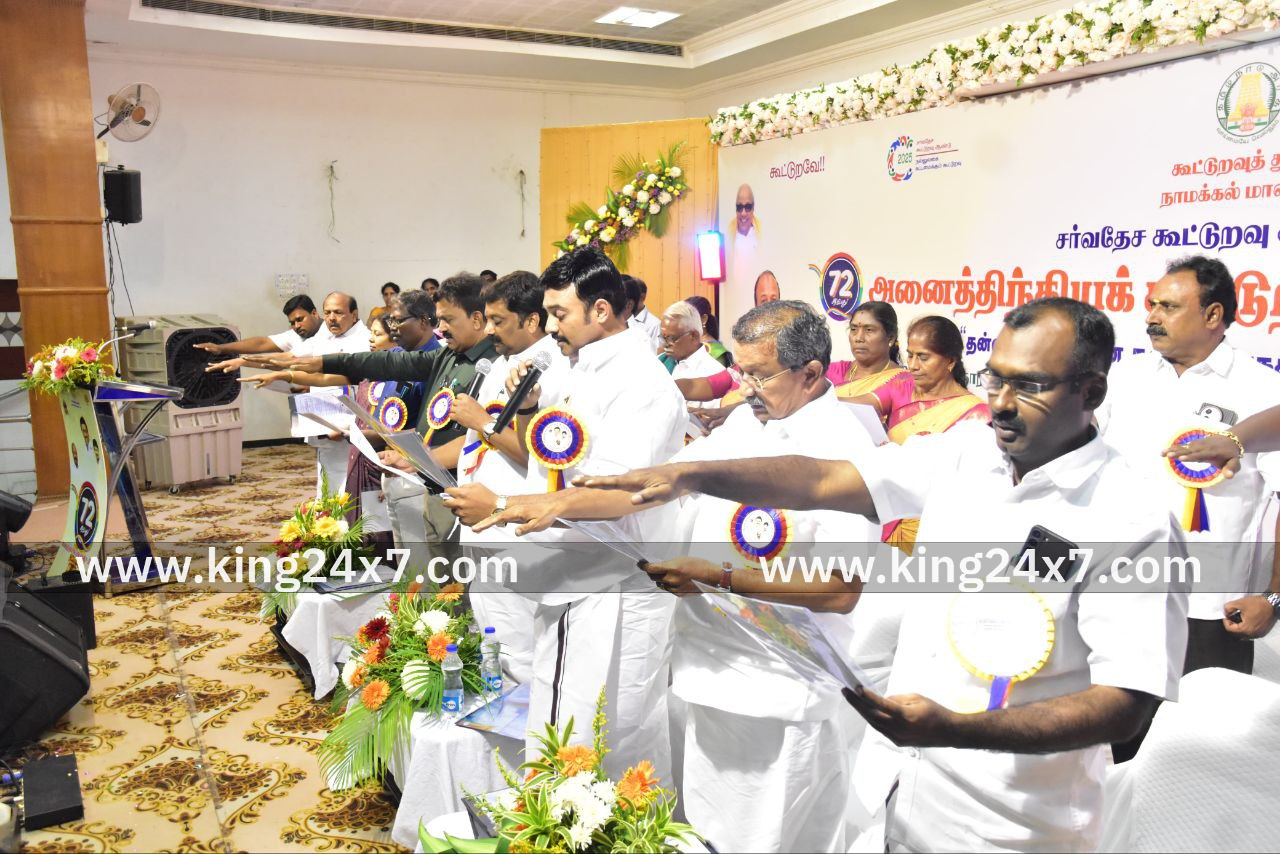 நாமக்கல் மாவட்டம், ஸ்ரீமஹால் திருமண மண்டபத்தில் இஆதிதிராவிடர் நலத்துறை அமைச்சர் மருத்துவர் மா.மதிவேந்தன் பாராளுமன்ற மாநிலங்களவை உறுப்பினர் மற்றும் நாமக்கல் மாவட்ட மத்திய கூட்டுறவு வங்கி தலைவர் கே.ஆர்.என்.இராஜேஸ்குமார் தலைமையில், மாண்புமிகு மேயர் .து.கலாநிதி முன்னிலையில் கூட்டுறவுத்துறையின் சார்பில் நடைபெற்ற 72-வது அனைத்திந்திய கூட்டுறவு வார விழா – 2025-ல் 4777 பயனாளிகளுக்கு ரூ.72.07 கோடி மதிப்பிட்டில் அரசு நலத்திட்ட உதவிகள், மாவட்ட அளவிலான சிறந்த கூட்டுறவு நிறுவனங்கள் மற்றும் பல்வேறு போட்டிகளில் வெற்றி பெற்ற பள்ளி மாணவ, மாணவியர்களை பாராட்டி பரிசுகள், பாராட்டு சான்றிதழ்கள் மற்றும் கேடயங்களை வழங்கினார்.முன்னதாக கூட்டுறவு வார விழா – 2025 முன்னிட்டு, பாராளுமன்ற மாநிலங்களவை உறுப்பினர் மற்றும் நாமக்கல் மாவட்ட மத்திய கூட்டுறவு வங்கி தலைவர்.கே.ஆர்.என்.இராஜேஸ்குமார் கூட்டுறவு சங்க கொடியினை ஏற்றி வைத்தார்.தமிழ்நாடு முதலமைச்சர் அவர்களின் ஆணைக்கிணங்க, நாமக்கல் மாவட்டத்தில் 14.11.2025 முதல் இன்று 20.11.2025 வரை கூட்டுறவுத்துறையின் சார்பில் 72-ஆவது அனைத்திந்தியக் கூட்டுறவு வார விழா-2025 சிறப்பாக நடைபெற்று கொண்டு இருக்கிறது. கூட்டுறவு வார விழாவில் சுற்றுலா, சுகாதாரம், பசுமை எரிசக்தி, கூட்டுறவு உருவாக்கும் தளங்கள், சமையலறை கூட்டுறவுகள் மற்றும் பல சாத்தியமான துறைகள் போன்ற வளர்ந்து வரும் பகுதிகளில் கூட்டுறவுகளை விரிவுபடுத்துதல் என்ற மைய கருத்தில் அனைத்து பகுதிகளிலும் ஒவ்வொரு நாளும் பல்வேறு போட்டிகள், கலைநிகழ்ச்சிகள் நடைபெற்றன. அந்த வகையில் கூட்டுறவு வார நிறைவு விழா மிக சிறப்பாக நடைபெற்று கொண்டிருக்கிறது. இந்த ஆண்டு மிகவும் பிரம்மாண்ட அளவில் சிறப்பாக ஏற்பாடு செய்யப்பட்டுள்ளது. நாமக்கல் மாவட்ட மத்திய கூட்டுறவு வங்கி சிறப்பாக செயல்பட்டு வருகிறது. கடந்த ஆண்டு தினசரி ரூ.5.00 கோடி என ரூ.1825 கோடி கடன் வழங்கப்பட்டுள்ளது. இந்த ஆண்டு தினசரி ரூ.7.50 கோடி என ரூ.2735 கோடியும், அடுத்த ஆண்டு தினசரி ரூ.10.00 கோடி என ரூ.3650 கோடி வழங்கப்படவுள்ளது. நாமக்கல் மாவட்ட மக்கள் பயன்பெறும் வகையில், நாமக்கல் மாவட்ட மத்திய கூட்டுறவு வங்கி சிறப்பாக செயல்பட்டு வருகிறது. நாமக்கல் மாவட்டத்தின் முக்கிய அடையாளமாக மத்திய கூட்டுறவு வங்கி மாறியுள்ளது. மேலும் நாமக்கல் மாவட்ட மத்திய கூட்டுறவு வங்கியானது மாநில அளவில் சிறப்பான கூட்டுறவு வங்கியாக திகழ அனைத்து நிர்வாகிகளும், பணியாளர்களும் சிறப்பாக பணியாற்ற வேண்டும். கூட்டுறவு வங்கிகளுக்கு முக்கியத்துவம் வழங்கி சிறப்பான முறையில் சர்வதேச நாடுகள் ஒருங்கிணைந்து இந்த ஆண்டை சர்வதேச கூட்டுறவு ஆண்டாக அறிவித்துள்ளார்கள். 