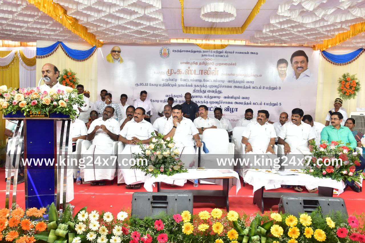 நாமக்கல் மாநகராட்சி, வேட்டாம்பாடியில் பொதுப்பணித்துறை, நெடுஞ்சாலைகள் மற்றும் சிறு துறைமுகங்கள் துறை அமைச்சர் எ.வ.வேலு ஆதிதிராவிடர் நலத்துறை அமைச்சர் மருத்துவர் மா.மதிவேந்தன் தலைமையில், பாராளுமன்ற மாநிலங்களவை உறுப்பினர் மற்றும் நாமக்கல் மாவட்ட மத்திய கூட்டுறவு வங்கிதலைவர் கே.ஆர்.என்.இராஜேஸ்குமார் நாமக்கல் பாராளுமன்ற உறுப்பினர் வி.எஸ்.மாதேஸ்வரன் நாமக்கல் சட்டமன்ற உறுப்பினர் பெ.ராமலிங்கம் , மேயர் .து.கலாநிதி மாவட்ட வருவாய் அலுவலர் மா.க.சரவணன் ஆகியோர் முன்னிலையில் விரிவான சாலை உட்கட்டமைப்பு மேம்பாட்டுத் திட்டம் 2025-2026-ன் கீழ், நாமக்கல் நகரில் மரூர்பட்டி - வேட்டாம்பாடி, வேட்டாம்பாடி - வசந்தபுரம் வரை ரூ.95.12 கோடி மதிப்பீட்டில் 2 புறவழிச்சாலைகளை திறந்து வைத்து, வசந்தபுரம் – லத்துவாடி, லத்துவாடி - வள்ளிபுரம் வரை ரூ.103.00 கோடி மதிப்பீட்டில் 2 புறவழிச்சாலைகளுக்கு அடிக்கல் நாட்டி, பணிகளை தொடங்கி வைத்தார். நாமக்கல் புறவழிச்சாலையின் திட்ட மதிப்பீடு - ரூ.297 கோடியாகும். முதலைப்பட்டி முதல் வள்ளிபுரம் வரை 22 கி.மீ.நீளத்திற்கு நடைபெறுகிறது.மொத்தம் கிராமங்கள் – 11, நிலஎடுப்பு பரப்பளவு -146 ஏக்கர், நிலஎடுப்பு தொகை - ரூ.104 கோடி, புறவழிச் சாலைப் பணி 5 கட்டங்களாக நடைபெற்று வருகிறது. முதல் கட்டப் பணிகள் ஏற்கெனவே முடிக்கப்பட்டு பொதுமக்கள் பயன்பாட்டில் உள்ளது.இதில் இன்றைய தினம் நாமக்கல் நகரில் மரூர்பட்டி முதல் வேட்டாம்பாடி வரை (கி.மீ 2/2-6/0 (கட்டம் 2), வேட்டாம்பாடி முதல் வசந்தபுரம் வரை (கி.மீ 6/0 -12/0- (கட்டம் 3) ஆகிய 2 புறவழிச்சாலைகள் பயன்பாட்டிற்கு திறந்து வைக்கப்பட்டுள்ளது. மீதமுள்ள இரண்டு கட்டப் பணிகளும் இன்று தொடங்கி வைக்கப்படுகிறது. மேலும், வசந்தபுரம் முதல் லத்துவாடி வரை (கி.மீ 12/0-16/0 (கட்டம் 4) மற்றும் லத்துவாடி முதல் வள்ளிபுரம் வரை (கி.மீ 16/0-22/387 (கட்டம் 5) ஆகிய புறவழிச்சாலைகளுக்கு அடிக்கல் நாட்டி பணிகள் தொடங்கி வைக்கப்பட்டுள்ளது.முதலைப்பட்டி முதல் புதிய பேருந்து நிலையம் வரை 1 கிலோ மீட்டர் நீளத்திற்கு ரூ.25 கோடி மதிப்பில் புறவழிச்சாலை - 800 மீட்டர், இணைப்பு சாலை -200 மீட்டர் கடந்த 22.10.2024 அன்று மாண்புமிகு தமிழ்நாடு முதலமைச்சர் அவர்களால் மக்கள் பயன்பாட்டிற்கு திறந்து வைக்கப்பட்டது. கட்டம் -2-ல் ரூ.119 கோடி மதிப்பில் 5 கிலோ மீட்டர் நீளத்திற்கு (ஒரு இரயில்வே மேம்பாலம் உட்பட) புதிய பேருந்து நிலையம் முதல் வேட்டாம்பாடி வரை புறவழிச்சாலை இன்று திறக்கப்பட்டுள்ளது. இரயில்வே மேம்பாலப் பணி 35% முடிக்கப்பட்டுள்ளது. மீதமுள்ள பணிகள் நடைபெற்று வருகிறது. ஜூலை-2026ல் இரயில்வே மேம்பாலத்தினை திறக்க திட்டமிடப்பட்டுள்ளது. மேலும், கட்டம் -3-ல் வேட்டாம்பாடி முதல் திருச்சி சாலை வரை ர