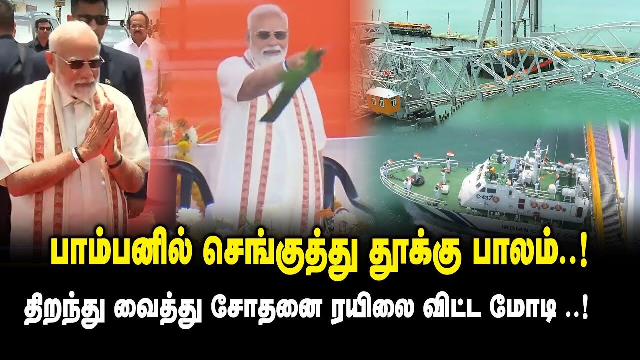 பாம்பனில் செங்குத்து தூக்கு பாலம்! திறந்து வைத்து சோதனை ரயிலை விட்ட Modi inaugurates Pamban Bridge