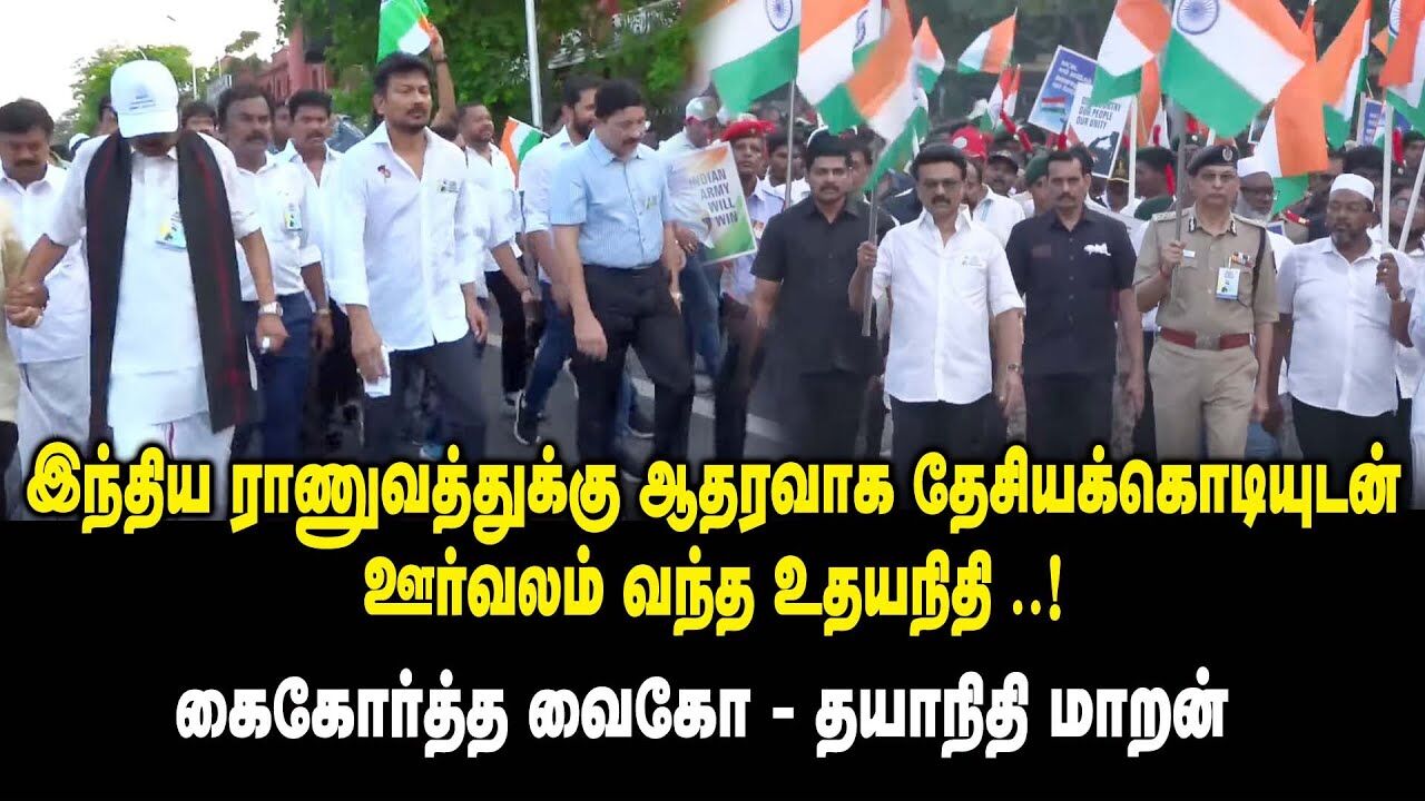 இந்திய ராணுவத்துக்கு ஆதரவாக தேசியக்கொடியுடன் ஊர்வலம் வந்த உதயநிதி! கைகோர்த்த Vaiko & Dayanidhi Maran
