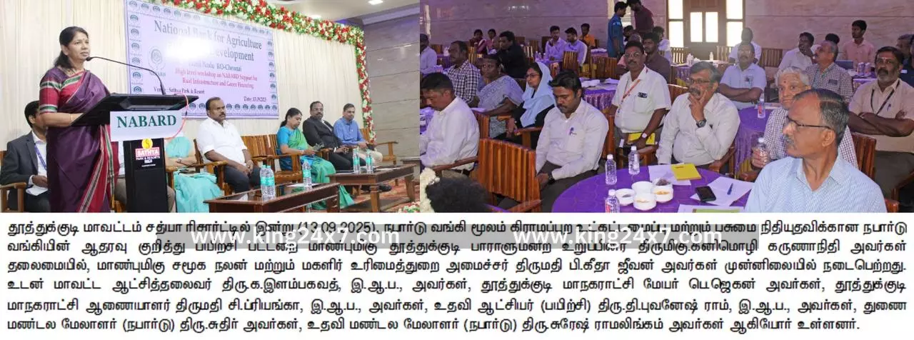 தூத்துக்குடியில் நபார்டு வங்கியின் ஆதரவுடன் பயிற்சி பட்டறை – கனிமொழி மற்றும் பி.கீதா ஜீவன் கலந்து கொண்டனர் தூத்துக்குடி மாவட்டம் சத்யா ரிசார்ட்டில் இன்று (13.09.2025), நபார்டு வங்கி மூலம் கிராமப்புற உட்கட்டமைப்பு மற்றும் பசுமை நிதியுதவிக்கான பயிற்சி பட்டறை நடைப்பெற்றது. இந்நிகழ்வில் தூத்துக்குடி பாராளுமன்ற உறுப்பினர் கனிமொழி கருணாநிதி அவர்கள் தலைமையிலவும், சமூக நலன் மற்றும் மகளிர் உரிமைத்துறை அமைச்சர் திருமதி பி.கீதா ஜீவன் அவர்கள் முன்னிலையிலும் விழா சிறப்பாக நடைபெற்றது. இந்நிகழ்வில் மாவட்ட ஆட்சியர் இளம்பகவத், மேயர் ஜெகன் பெரியசாமி ஆணையர் பிரியங்கா உள்ளிட்டோர் கலந்து கொண்டனர்