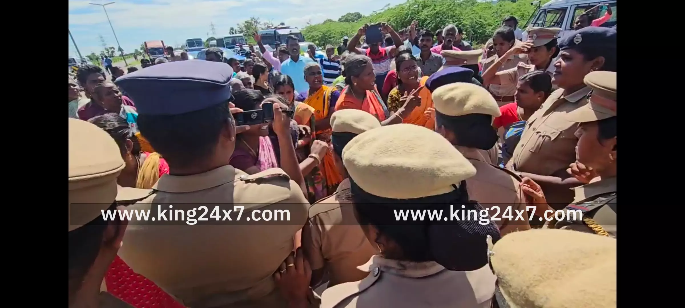 தூத்துக்குடி திருநெல்வேலி தூத்துக்குடி தேசிய நெடுஞ்சாலையில் சாலை மறியலில் ஈடுபட்ட பொட்டலுரணி கிராமத்தைச் சேர்ந்த பெண்கள் ஆண்கள் உள்ளிட்டோர் மீது காவல்துறை அராஜகமாக தாக்குதல் இரண்டு பேருக்கு காயம் குண்டுகட்டாக பெண்களை கைது செய்து சிறைப்படுத்தியதால் பரபரப்பு காவல்துறையினர் பொதுமக்கள் இடையே கடும் வாக்குவாதம் போர்க்களம் போல் ஆன தூத்துக்குடி திருநெல்வேலி தேசிய நெடுஞ்சாலை பொட்டலூரணி கிராம விலக்கு பகுதியில் தூத்துக்குடி திருநெல்வேலி தேசிய நெடுஞ்சாலையில் அரசு பேருந்து உள்ளிட்ட அனைத்து பேருந்துகளும் நின்று செல்ல வேண்டும் பொட்டலூரணி கிராமம் அருகே செயல்பட்டு வரும் மீன் கழிவுகளை மூட வேண்டும் என வலியுறுத்தி தூத்துக்குடி திருநெல்வேலி தேசிய நெடுஞ்சாலையில் நூற்றுக்கு மேற்பட்ட ஆண்கள் பெண்கள் சாலை மறியல் போராட்டத்தில் ஈடுபட்டனர் அப்போது அவர்களுடன் வருவாய்த்துறை என பேச்சு வார்த்தையில் ஈடுபட்டு கொண்டிருந்தனர் பேச்சுவார்த்தை நடந்து கொண்டு இருக்கும்போதே அந்தப் பகுதியில் உள்ளே நுழைந்த ரூரல் டிஎஸ்பி சுதீர் சாலை மறியல் ஈடுபட்டவர்களுடன் வாக்குவாதத்தில் ஈடுபட்டு தள்ளுமுள்ளுவில் ஈடுபட துவங்கினார் மேலும் பெண்கள் உள்ளிட்டோரையும் தாக்க துவங்கினர் இதில் சில ஆண் காவலர்களும் பெண்களை பிடித்து இழுக்க துவங்கினர் இதன் காரணமாக அந்த பகுதியில் பெரும் பரபரப்பு ஏற்பட்டது இதைத் தொடர்ந்து போராட்டத்தில் ஈடுபட்டவர்கள் மற்றும் காவல் துறையினர் இடையே தள்ளுமுள்ளு ஏற்பட்டது காவல்துறையினர் போராட்டத்தில் ஈடுபட்டவர்களை குண்டு கட்டாக தூக்கி கைது செய்யும் முயன்றனர் அப்போது போராட்டத்தில் ஈடுபட்ட செல்வ நாராயணன் என்பவருக்கு காவல்துறையினர் தாக்கியதில் கையில் காயம் ஏற்பட்டது மேலும் ஒரு பெண்ணிற்கு கால் முறிவு ஏற்பட்டது ஆனால் காவல்துறையினர் இது எதையும் கண்டு கொள்ளாமல் போராட்டத்தில் ஈடுபட்ட ஆண்கள் பெண்கள் ஆகியவரை தங்கள் அராஜகத்தின் மூலம் கைது செய்து வேனில் ஏற்றினர் இதற்கு அந்த பகுதியில் போராட்டத்தில் ஈடுபட்ட பெண்கள் கடும் எதிர்ப்பு தெரிவித்தனர் அதையும் மீறி முதியவர்கள் பெண்கள் உள்ளிட்டோரை காவல்துறையினர் கைது செய்து கொண்டு சென்றனர் இதன் காரணமாக அந்த பகுதி முழுவதும் போர்க்களம் போல் காட்சியளித்தது மேலும் காவல்துறையினர் செய்தியாளர்களை செய்தி சேகரிக்க விடாமல் தடுத்து நிறுத்தி அராஜகத்திலும் ஈடுபட்டனர்
