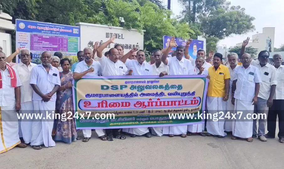 நாமக்கல் மாவட்டம் குமாரபாளையம் வட்டாட்சியர் அலுவலகம் கடந்த 2016 ஆம் ஆண்டு செயல்பட்டு வருகிறது மேலும் குமாரபாளையத்தில் குற்றவியல் நீதிமன்றம் மற்றும் உரிமைகள் நீதிமன்றங்கள் செயல்பட்டு வருகிறது இந்நிலையில் குமாரபாளையத்தில் காவல் உட் கோட்டம் அமைப்பதற்காக கடந்த மார்ச் மாதம் நடைபெற்ற சட்டமன்ற கூட்டத்தொடரில் குமாரபாளையம் சட்டமன்றத் தொகுதி உறுப்பினர் தங்கமணி கேள்வி எழுப்பியதின் பேரில் தமிழக காவல்துறை அமைச்சர் முதல் வருமான மு க ஸ்டாலின் பேசும் பொழுது உட்பட்ட அலுவலகம் அமைக்க அரசாணை பிறப்பிக்கப்பட்டது இதனை அடிப்படையில் குமாரபாளையம் பகுதியில் போதிய காவல் நிலையங்கள் ஆய்வாளர்கள் இல்லாததை நிரப்பும் வகையில் பேட்டை பகுதியில் ஒரு காவல் நிலையமும் அதற்கு அலுவலர்களும் நியமிக்கப்பட்டனர் எப்படி காவல் நிலையத்தில் உதவி காவல் ஆய்வாளர் இருந்த பகுதியை காவல் ஆய்வாளர் என தர உயர்த்தி காவல் ஆய்வாளர் நியமிக்கப்பட்ட இலையில் உட்கோட்ட பகுதி அறிவிக்கப்பட்டது ஆனால் குமாரபாளையம் பகுதியை உட்கட்டமாக பிரிக்காமல் பள்ளிபாளையம் உட்கோட்டமாக பிரிக்கப்பட்டது இதற்கு எதிர்ப்பு தெரிவித்து குமாரபாளையத்தை சேர்ந்த அனைத்து கட்சியினரும் மற்றும் பொதுநல அமைப்பினரும் மாவட்ட ஆட்சியர் மாவட்ட கண்காணிப்பாளர் மேற்கு மண்டல காவல்துறை தலைவர் மற்றும் ஈரோடு பாராளுமன்ற உறுப்பினர் குமாரபாளையம் சட்டமன்ற உறுப்பினர் என பல்வேறு அதிகாரிகளுக்கு அரசியல் பிரமுகர்களுக்கும் புகார் மனு அளித்தனர் இதுவரை கவித தகவலும் வராத பட்சத்தில் அரசுக்கு கவன ஈர்ப்பு ஏற்படுத்தும் வகையில் அதிமுகவின் ஒருங்கிணைப்பு குழு அணி மாவட்ட செயலாளர் ஏ கே நாகராஜன் தலைமையில் அனைத்துக் கட்சியினர் மற்றும் பொதுநல அமைப்பினர் மாவட்ட ஆட்சியர் அலுவலகம் முன்பு இன்று கண்டடா ஆர்ப்பாட்டத்தில் ஈடுபட்டனர்