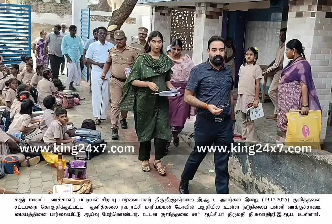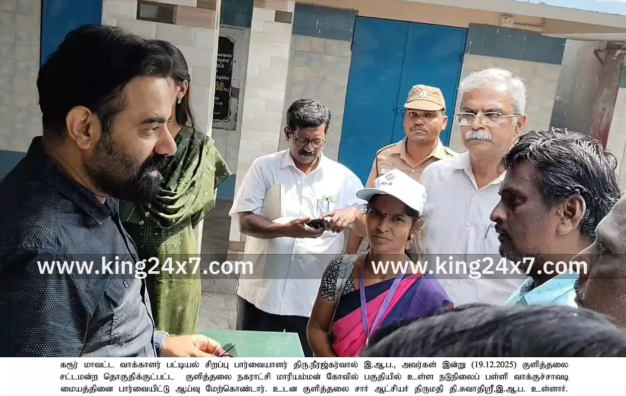 Kulithalai King 24x7 |19 Dec 2025 2:10 PM ISTகுளித்தலை நகராட்சி மாரியம்மன் கோவில் வாக்கு சாவடி மையத்தை பார்வையிட்டு ஆய்வு