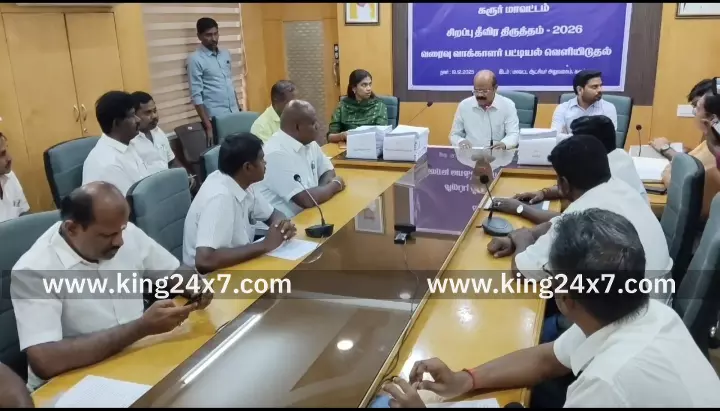 Karur King 24x7 |19 Dec 2025 5:19 PM ISTகரூர்-வாக்காளர் பட்டியல் சிறப்பு தீவிர திருத்தத்திற்கு பிறகு வரைவு வாக்காளர் பட்டியலை ஆட்சியர் தங்கவேல் அங்கீகரிக்கப்பட்ட அரசியல் கட்சிகள் பிரதிநிதிகள் முன்னிலையில் வெளியிட்டார்.