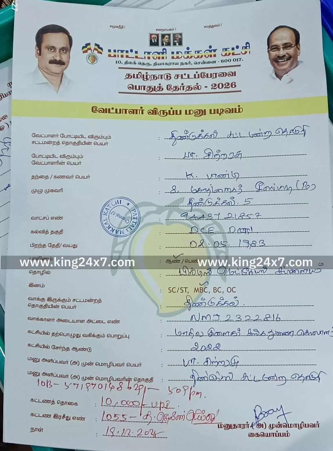 திண்டுக்கல் பாட்டாளி மக்கள் கட்சி சார்பில் திண்டுக்கல் சட்டமன்றத் தொகுதியில் மற்றும் ஆத்தூர் சட்டமன்ற தொகுதியில் போட்டியிடுவதற்காக மாநில இளைஞரணி துணைச் செயலாளர் திரு சிற்றரசு அவர்கள் விருப்பம் மனு தாக்கல் செய்தார்