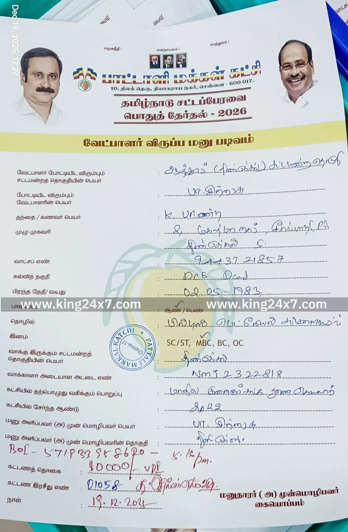 பாட்டாளி மக்கள் கட்சியின் சார்பில் வழங்கினார் விருப்ப மனு