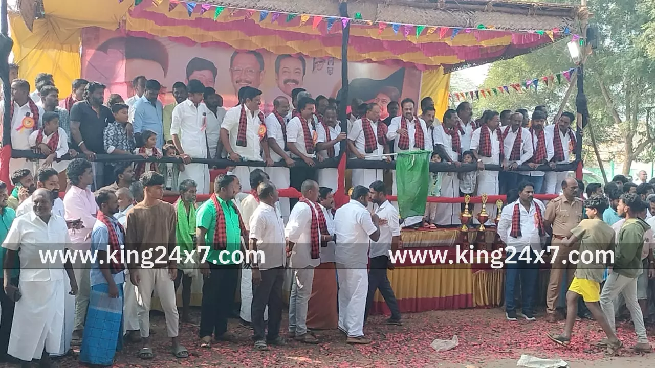 திமுக கழக இளைஞரணி செயலாளர் தமிழ்நாடு துணை முதலமைச்சர் உதயநிதி ஸ்டாலின் 48 வது பிறந்தநாளை முன்னிட்டு புதுக்கோட்டை வடக்கு மாவட்ட குன்றாண்டார் கோவில் மத்திய ஒன்றிய திமுக கழகத்தின் சார்பில் மாபெரும் மாட்டு வண்டி குதிரை வண்டி பந்தயம் நடைபெற்றது போட்டியை துவக்கி வைப்பதற்காக கனிமவளத் துறை அமைச்சர் எஸ் ரகுபதி மாவட்ட செயலாளர் கே கே செல்லபாண்டியன் குளவாய்ப்பட்டி மத்திய ஒன்றிய கழகச் செயலாளர் ஒன்றிய கவுன்சிலர் சி சண்முகம் தலைமையில் நடைபெற்றது போட்டியில் பெரிய மாடு சிறிய மாடு குதிரைப் பந்தயம் முதலில் பெரிய மாடு போட்டியினை கனிமவளத்துறை அமைச்சர் ரகுபதி கொடியசைத்து துவக்கி வைத்தார் 8 மயில் தூரம் கணக்கிடப்பட்டு மாட்டு வண்டிகள் சீறி பாய்ந்து சென்றன இதனை இருபுறமும் பொதுமக்கள் கண்டு ரசித்தனர் போட்டியில் வெற்றி பெற்று வரும் மாட்டு வண்டி உரிமையாளர்கள் சாரதி முதல் பரிசு 40,000 ரூபாய் 2 ஆம் பரிசு 30 ஆயிரம் மூன்றாம் பரிசு 20 ஆயிரம் நான்காம் பரிசு பத்தாயிரம் என பரிசுத்தொகை சான்றிதழ்களும் கனிமவளத்துறை அமைச்சர் எஸ் ரகுபதி வடக்கு மாவட்ட செயலாளர் கே கே செல்லபாண்டியன் மற்றும் குளவாய்ப்பட்டி மத்திய ஒன்றிய கழக செயலாளர் சி சண்முகம் தலைமையில் வெற்றி பெற்ற மாட்டின் உரிமையாளருக்கும் சாரதிக்கும் பரிசு தொகை சான்றிதழ் வழங்கப்பட்டன ஒன்றிய பெருந்தலைவர் கே ஆர் எம் போஸ் மாவட்ட கவுண்சிலர்கள் செல்வம் கை.பழனிச்சாமி திமுக நிரவாகி தாயின்பட்டி கண்னன் ராஜதுரை எழில்ராஜா சபா குறிஞ்வானன் நகர செயலாளர் அண்ணாதுரை மற்றும் ஏராளமான நிர்வாகிகள் கலந்துகொண்டனர்