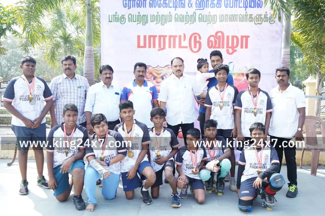 புதுக்கோட்டை மாவட்டத்தைச் சார்ந்த ரோலர் ஸ்கேட்டிங் மற்றும் ரோலர் ஹாக்கி விளையாட்டு வீரர், வீராங்கனைகள் மாநிலம் மற்றும் தேசிய அளவில் நடைபெற்ற ரோலர் ஸ்கேட்டிங் மற்றும் ஹாக்கி போட்டிகளில் பங்கு பெற்று மற்றும் வெற்றி பெற்ற மாணவர்களுக்கு நடைபெற்ற பாராட்டு விழாவில் புதுக்கோட்டை சட்டமன்ற உறுப்பினர் டாக்டர் வை முத்துராஜா விளையாட்டு வீரர்களை பாராட்டி சான்றிதழ்கள் வழங்கி கௌரவித்தார் இந்நிகழ்வில் ரோலர் ஸ்கேட்டிங் மற்றும் ஹாக்கி பயிற்சியாளர்கள், விழா ஏற்பாட்டாளர்கள், விளையாட்டு வீரர், வீராங்கனைகள், பொதுமக்கள் உடனிருந்தனர்.