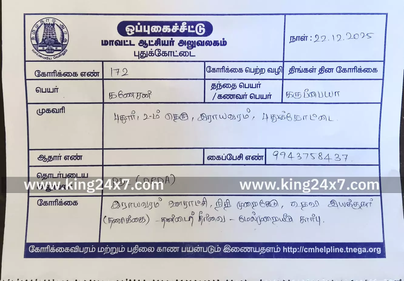 Pudukkottai King 24x7 |22 Dec 2025 6:03 PM ISTபுதுக்கோட்டை மாவட்ட ஆட்சியரின் குறை தீர் மனு நீதி நாளில் இன்று 22.12.2025 உயர்நீதிமன்ற மதுரை கிளையில் உத்தரவின் பேரில் உதவி இயக்குனர் (தணிக்கை) இராயவரம்ஊராட்சியில் தணிக்கை செய்து நிதி இழப்பை கண்டறிந்து தண்டத்தீர்வையாக ரூ 466422 விதித்ததை ரத்து செய்ய மனு.