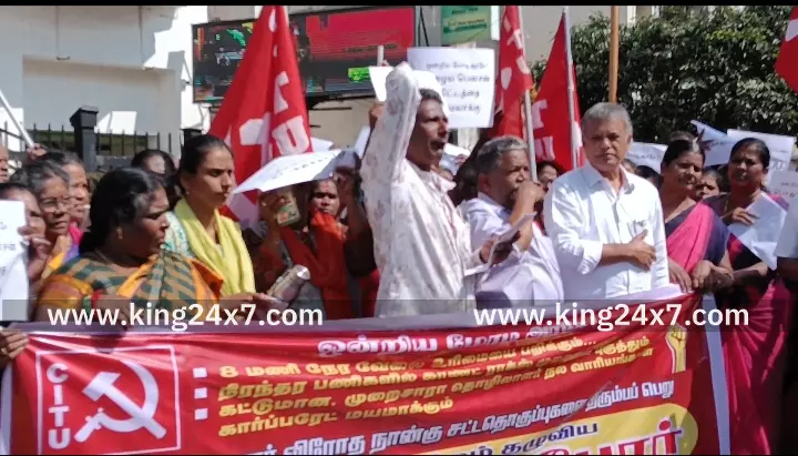 கரூரில் தொழிலாளர் விரோத நான்கு சட்ட தொகுப்புகளை திரும்பப் பெற வலியுறுத்தி சிஐடியு சார்பில் மறியல் போராட்டம்.