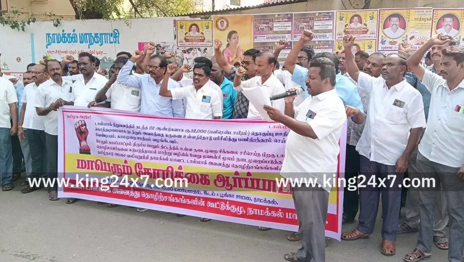 டாஸ்மாக் கடை ஊழியர்கள் சங்கத்தின் சார்பில் ஆர்ப்பாட்டம் மாவட்ட செயலாளர் சரவணன் தலைமையில் நடைபெற்றது இதில் தமிழக அரசு டாஸ்மாக் கடை விற்பனை செய்த காலி பாட்டில்களை திரும்ப பெறும் திட்டத்தை கைவிட வேண்டும் என கோரிக்கை கோஷங்களை முழங்கினர் இதில் நாமக்கல் மாவட்டத்தில் உள்ள சுமார் 200க்கும் மேற்பட்ட டாஸ்மாக் கடை விற்பனை ஊழியர்கள் பலர் பங்கேற்றனர்