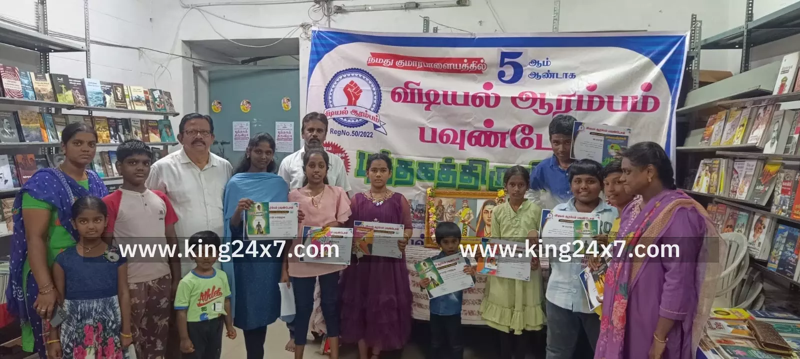 குமாரபாளையம் விடியல் ஆரம்பம் சார்பாக புத்தகத் திருவிழா நடக்கிறது. இதில் வேலு நாச்சியார், வீரபாண்டிய கட்டபொம்மன் மற்றும் சாவித்திரிபாய் பூலே பிறந்தநாள் முப்பெரும் விழாவாக, அமைப்பாளர் விடியல் பிரகாஷ் தலைமையில் நடந்தது. சௌடேஸ்வரி அனைவரையும் வரவேற்றார். இதில் பள்ளி மாணவ மாணவர்களுக்கு சிறுகதை எழுதுதல், கதை சொல்லுதல், பேச்சுப்போட்டி, வைக்கப்பட்டு வெற்றி பெற்றவர்களுக்கு சான்றிதழ் மற்றும் பரிசு புத்தகங்கள் வழங்கப்பட்டது. புத்தகத் திருவிழாவில் மாணவ மாணவிகள் பார்வையிட்டு அவர்களுக்கு தேவையான புத்தகங்களை வாங்கிச் சென்றனர். ஜமுனா நன்றி உரையாற்றினர். புத்தகத் திருவிழாவில் தொடர்ந்து மாணவர்களுக்கு போட்டிகள் வைக்கப்பட்டு சான்றிதழ் மற்றும் பரிசு புத்தகங்கள் வழங்கப்படுகிறது. விழாவில் பாரதி பதிப்பகம் இளங்கோ, நியூ செஞ்சுரி புக் முத்துகிருஷ்ணன், ஏசுதாஸ், தீனா,தினக்கல்வி சசி,சுமதி, ஆகியோர் கலந்து கொண்டு சிறப்பித்தனர்.