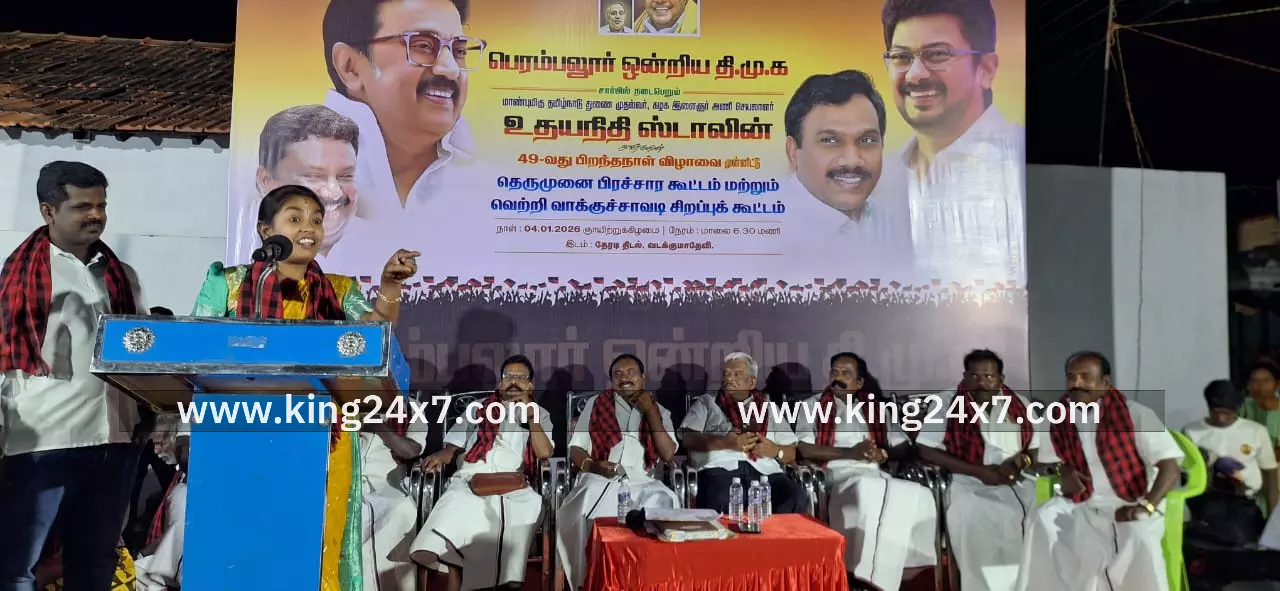 Perambalur King 24x7 |4 Jan 2026 9:30 PM ISTபெரம்பலூர் ஒன்றிய தி.மு.க.சார்பில், வடக்கு மாதவி கிராமத்தில், துணை முதலமைச்சர் உதயநிதி ஸ்டாலின் அவர்களின் பிறந்தநாள் விழா! தெருமுனைப் பிரச்சார கூட்டம் மற்றும் வெற்றி வாக்குச்சாவடி சிறப்புக்கூட்டம் நடைபெற்றது! கழக செய்தி தொடர்பாளர் க.நாகநந்தினி யுவராஜ், மாவட்ட கழக பொறுப்பாளர் வீ.ஜெகதீசன் பங்களிப்