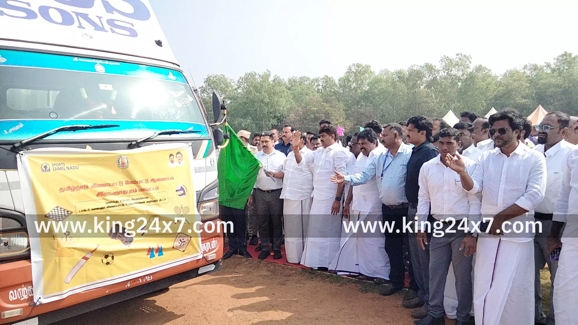 ராமநாதபுரம் மாவட்டம் மாவட்ட ஆட்சியர் அலுவலகம் அருகே உள்ள சேதுபதி விளையாட்டு மைதான வளாகத்தில் இளைஞர்நலன் மற்றும் விளையாட்டு மேம்பாட்டு துறையின் சார்பில் 12.35 கோடி மதிப்பீட்டில் புதிய செயற்கை இலை ஓடுதள பாதை அமைப்பதற்கான பூமிபூஜை பணியினை வனம் மற்றும் கதர் துறை அமைச்சர் ராஜகண்ணப்பன் துவக்கி வைத்து விளையாட்டு மேம்பாட்டு துறையின் மூலம் டாக்டர் கலைஞர் விளையாட்டு உபகரணங்கள் வழங்கும் திட்டத்தின் கீழ் விளையாட்டு உபகரண தொகுப்புக்களை பயனாளிகளுக்கு வழங்கியும்,கலைஞர் விளையாட்டு உபகரணங்கள் வழங்கும் திட்டத்தின் கீழ் விளையாட்டு உபகரண தொகுப்புக்களை நகராட்சி மற்றும் பேரூராட்சிகளுக்கு வழங்கிடும் வகையில் விளையாட்டு உபகரணங்கள் அடங்கிய வாகனத்தை கொடியசைத்து துவக்கி வைத்தார்.உடன் மாவட்ட ஆட்சித் தலைவர் சிம்ரன்ஜீத் சிங் காலோன்,ராமநாதபுரம் நாடாளுமன்ற உறுப்பினர் நவாஸ்கனி,ராமநாதபுரம் சட்டமன்ற உறுப்பினர் காதர்பாட்ஷா முத்துராமலிங்கம், பரமக்குடி சட்டமன்ற உறுப்பினர் முருகேசன், திருவாடானை சட்டமன்ற உறுப்பினர் கருமாணிக்கம், ராமநாதபுரம் நகர்மன்ற தலைவர் கார்மேகம், துணைத் தலைவர் பிரவீன்தங்கம் ஆகியோர் இந்நிகழ்ச்சியில் பங்கு பெற்றனர்.