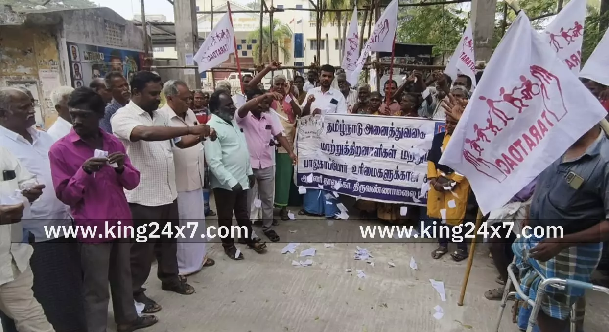 Arani King 24x7 |6 Jan 2026 11:42 PM ISTதமிழ்நாடு அனைத்து வகை மாற்றுத் திறனாளிகள் மற்றும் பாதுகாப்போடு உரிமைகளுக்கான சங்கம் சார்பில் மத்திய அரசு கொண்டுவந்துள்ள தேசிய ஊரக வேலை உறுதி திட்டத்தில் மாற்றம் கொண்டு வந்த சட்டத்தை எதிர்த்து ஆரணி மற்றும் மேற்குஆரணி ஊராட்சி ஒன்றிய அலுவலகங்கள் முன்பு சட்ட நகல் எரிப்பு போராட்டம் நடத்தின