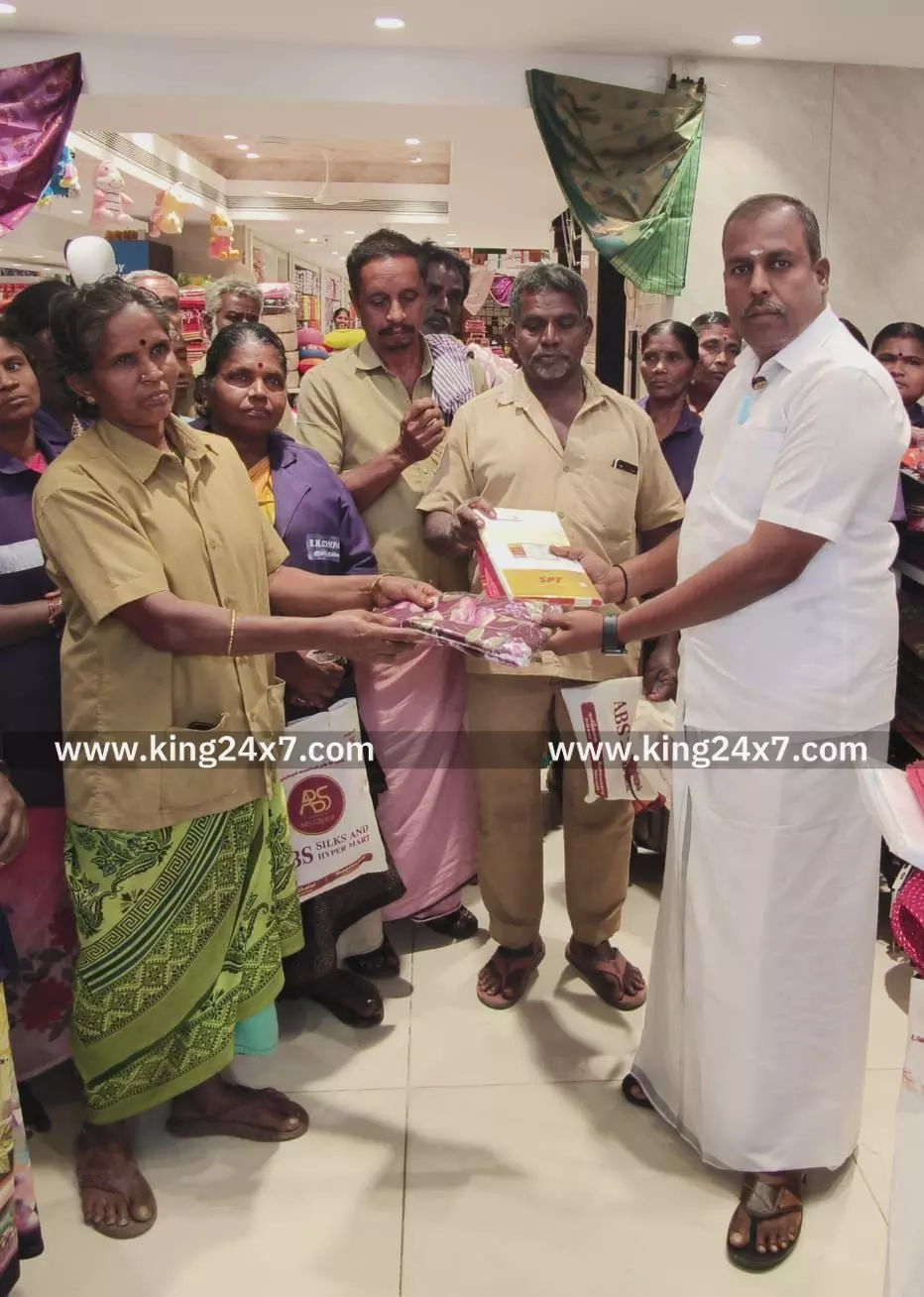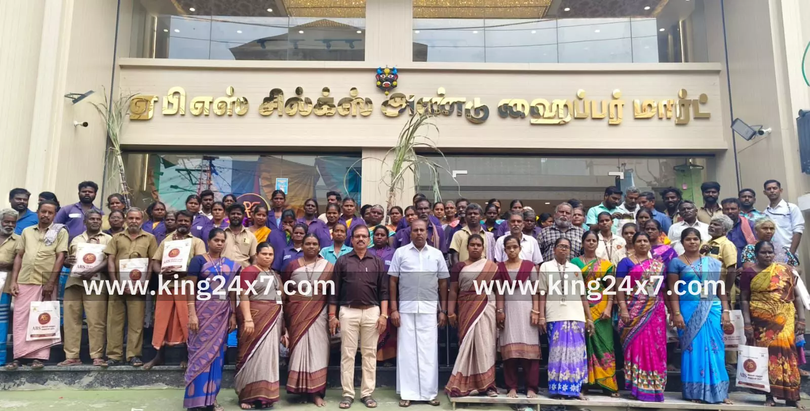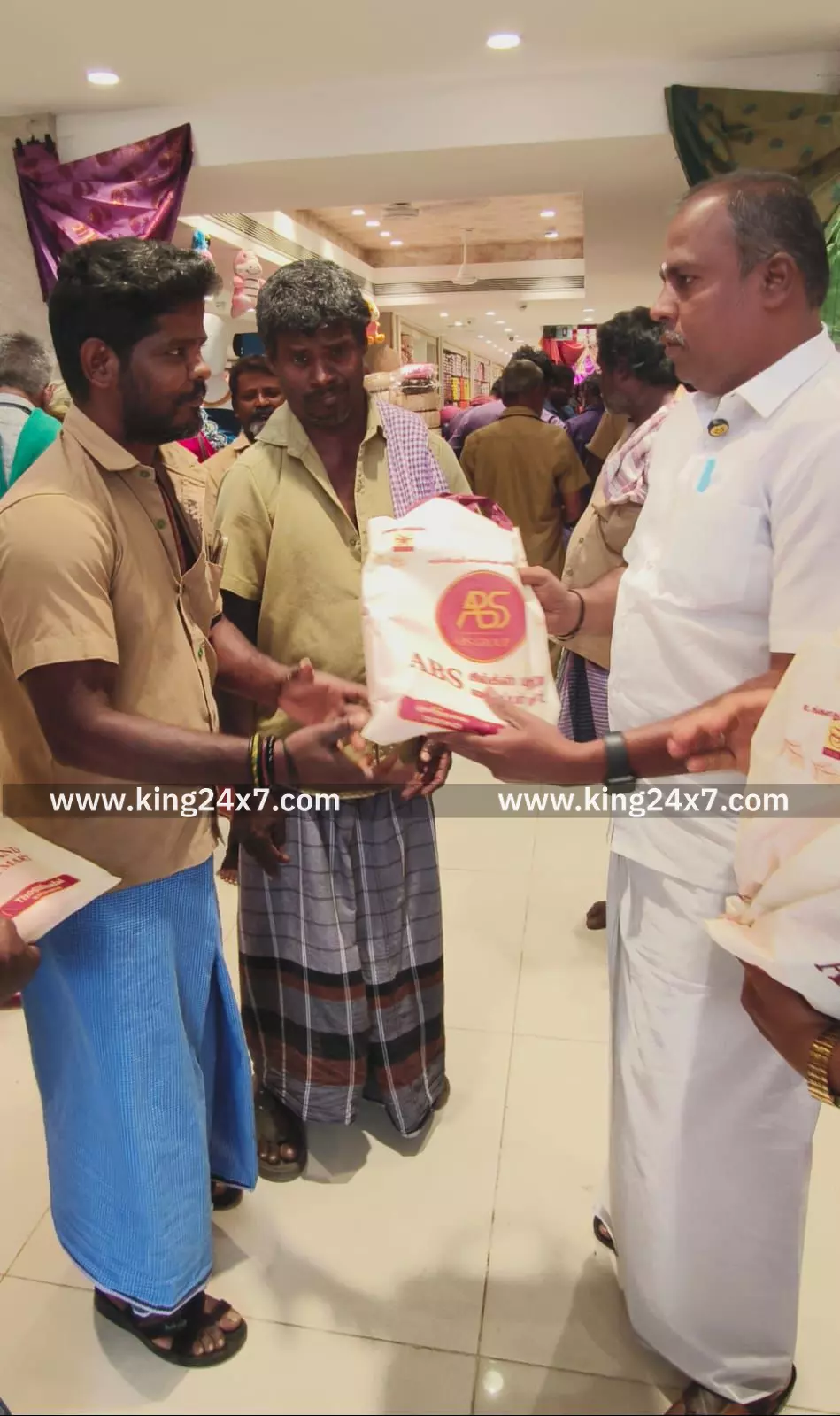 கரூர் மாவட்டம் குளித்தலை நகராட்சி அலுவலகம் கட்டிடம் அருகே உள்ள கட்டிடத்தில் பிரபலமான ஏபிஎஸ் சில்க்ஸ் அண்டு ஹைப்பர் மார்ட் நிறுவனம் புதிதாக கடந்த ஆண்டு தொடங்கப்பட்டது. அதன் உரிமையாளர் சீனிவாசன் என்பவர் இன்று குளித்தலை நகராட்சி அலுவலகத்தில் பணிபுரியும் தூய்மை பணியாளர்கள் மற்றும் டெங்கு ஒழிப்பு பணியாளர்கள் என மொத்தம் 102 நபர்களை தங்களது கடைக்கு வரவழைத்து பொங்கல் திருநாளை முன்னிட்டு ஆண்களுக்கு வேட்டி துண்டு மற்றும் பெண்களுக்கு சேலைகளை பொங்கல் பரிசாக வழங்கியுள்ளார். மேலும் நகராட்சியில் பணிபுரியும் தூய்மை பணியாளர்களுக்கு ஜவுளிகள் வாங்குவதில் 5% தள்ளுபடி கூப்பன்களும் வழங்கி பொங்கல் வாழ்த்துகளை தெரிவித்துக் கொண்டார்.