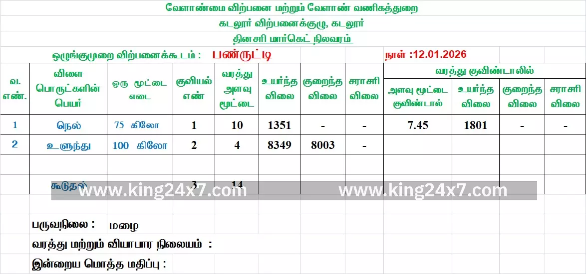 கடலூர் மாவட்டம் பண்ருட்டி ஒழுங்குமுறை விற்பனைக் கூடத்தில் தினந்தோறும் மார்க்கேட் நிலவரம் அறிவிப்பு மாறுபட்டு வருகிறது. இந்த நிலையில் இன்று (ஜனவரி 12) நெல் வரத்து 10 மூட்டை, உயர்ந்த விலை 1351, உளுந்து வரத்து 4 மூட்டை, உயர்ந்த விலை 8349, குறைந்த விலை 8003 என மொத்தம் 14 மூட்டை வந்துள்ளது. இது மட்டும் இல்லாமல் வேறு எந்த இடு பொருட்களும் வரவில்லை.
