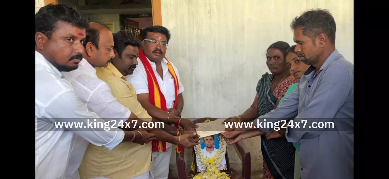 நாமக்கல் மாவட்டம் எலச்சிபாளையம் அருகே புஞ்சை புதுப்பாளையம் கிராமத்தை சேர்ந்த பொன்னுசாமி, வனிதா தம்பதியினரின் மகன் பரணிதரன் ( வயது 21) , இவர் தனியார் கல்லூரியில் 3 ம் ஆண்டு படித்து வந்தார். தமிழக வெற்றிக் கழகத்தில் இணைந்து கட்சிப் பணியை தீவிரமாக மேற்கொண்டு வந்த நிலையில் உடல்நிலை சரியில்லாமல் கடந்த 3 மாதங்களுக்கு முன்பு இறந்து விட்டார். இவரது இறப்பு கட்சியினர் மத்தியில் பெரும் அதிர்ச்சி ஏற்படுத்தியதையடுத்து நாமக்கல் மேற்கு மாவட்ட செயலாளர் சதீஷ்குமார் தலைமையில் தமிழக வெற்றிக்கழகத்தினர் பரணிதரனின் இல்லத்திற்கு சென்று அவரது திருவுருவ படத்திற்கு மலர்தூவி அஞ்சலி செலுத்தினர். பின்னர் பரணிதரனின் குடும்பத்தினருக்கு ஆறுதல் கூறி ரூ.50 ஆயிரம் ரொக்கப்பணம், வீட்டிற்கு தேவையான அரிசி, மளிகை பொருட்கள் வழங்கினர் மேலும் பரணிதரனின் தங்கையான பிரியதர்ஷினியின் படிப்பு செலவை தமிழக வெற்றிக்கழகத்தின் நாமக்கல் மேற்கு மாவட்டம் ஏற்பதாக மாவட்ட செயலாளர் சதீஷ்குமார் உட்பட நிர்வாகிகள் உறுதி அளித்தனர்