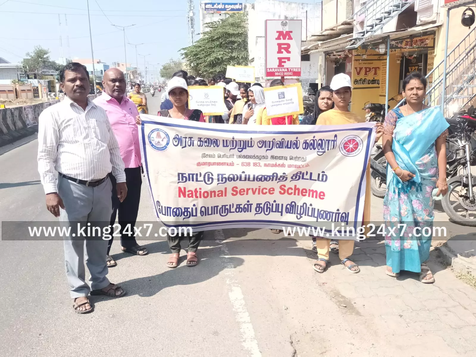 குமாரபாளையம் அரசு கலை மற்றும் அறிவியல் கல்லூரி சார்பில் நான்காம் நாள் நாட்டு நலப்பணித் திட்ட முகாம் முதல்வர் (பொ) சரவணாதேவி தலைமையில் நடந்தது திட்ட அலுவலர் ரமேஷ் குமார் வரவேற்றார். சிறப்பு அழைப்பாளர்களாக கணினி அறிவயல் துறை தலைவர் கார்த்திகேயனி, இயற்பியல் துறை தலைவர் அனுராதா பங்கேற்று போதை பொருட்களால் ஏற்படும் தீமைகள் குறித்து பேசினர். மேலும் போதை பொருட்கள் ஒழிப்பு விழிப்புணர்வு பேரணி நடைபெற்றது.