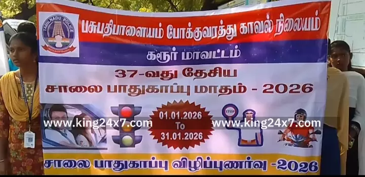 Karur King 24x7 |23 Jan 2026 1:23 PM ISTகரூரில் போக்குவரத்து காவல்துறை சார்பில் நடைபெற்ற சாலை பாதுகாப்பு விழிப்புணர்வு பேரணியை கரூர் காவல் துணை கண்காணிப்பாளர் செல்வராஜ் கொடி அசைத்து துவக்கி வைத்தார்.