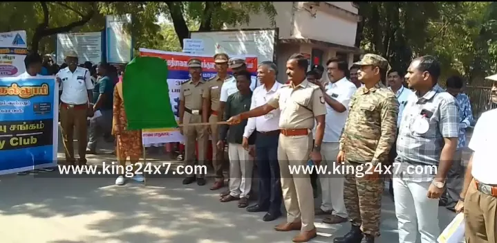 கரூரில் போக்குவரத்து காவல்துறை சார்பில் நடைபெற்ற சாலை பாதுகாப்பு விழிப்புணர்வு பேரணியை கரூர் காவல் துணை கண்காணிப்பாளர் செல்வராஜ் கொடி அசைத்து துவக்கி வைத்தார்.