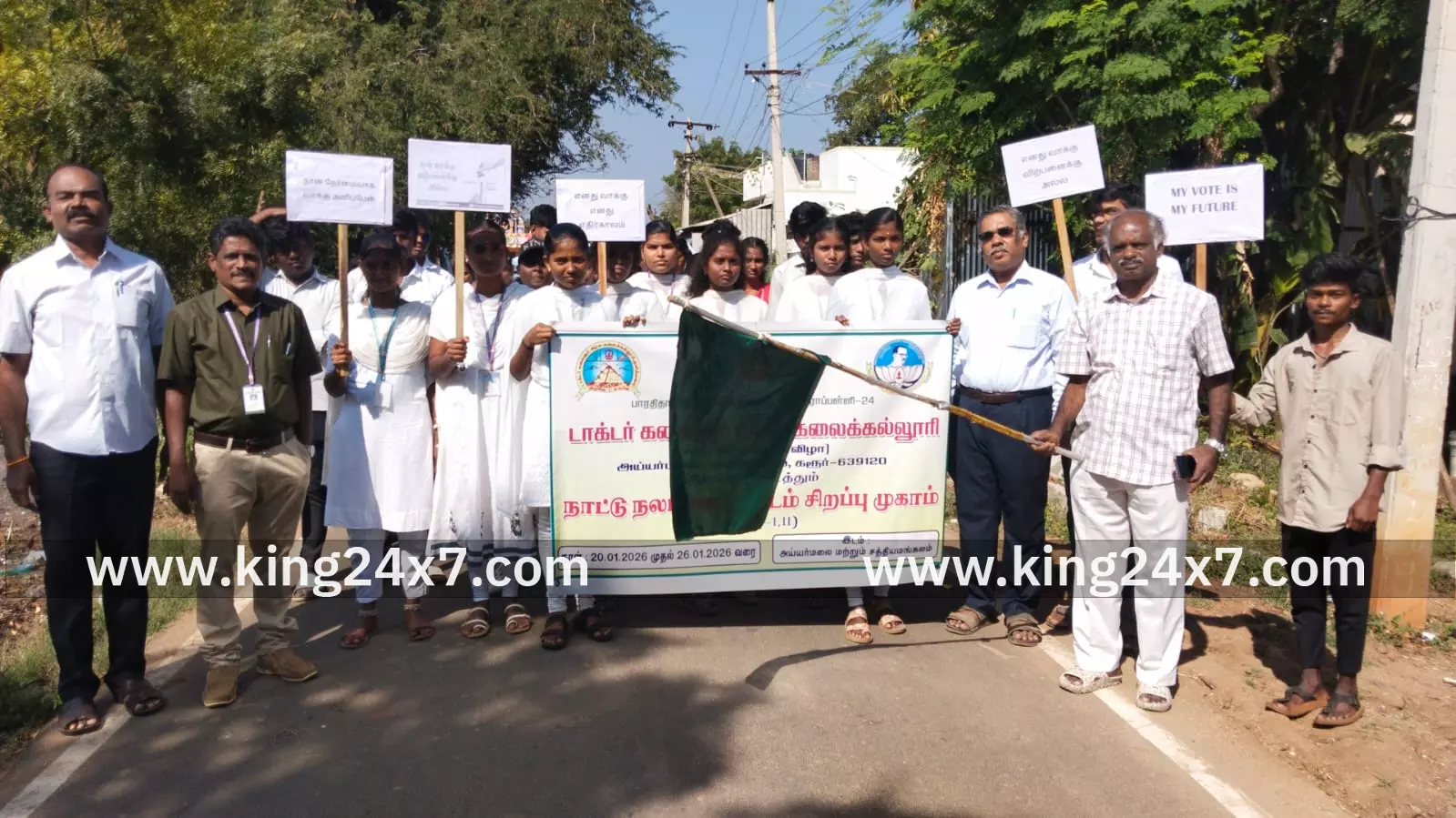 குளித்தலை டாக்டர் கலைஞர் அரசு கலைக் கல்லூரி நாட்டு நலப்பணித் திட்டம் சார்பில் வாக்காளர் விழிப்புணர்வு பேரணி தேர்தல் பிரிவு சிறப்பு தாசில்தார் வெங்கடேசன் தலைமையில் நேற்று நடைபெற்றது. முன்னதாக மாணவர்களிடையே தேர்தல் தொடர்பான விழிப்புணர்வு கருத்துக்களை எடுத்துக் கூறியும் மாணவர்கள் ஜனநாயக கடமை ஆற்றுவதன் அவசியம் குறித்த கருத்துக்களை தேர்தல் பிரிவு துணை தாசில்தார் ஜெயவேல் காந்தன் கூறினார். இதனைத் தொடர்ந்து தாசில்தார் வெங்கடேசன் கொடி அசைத்து பேரணியை தொடங்கி வைத்தார். பேரணியானது, சத்தியமங்கலம் பேருந்து நிலையம், கடைவீதி மற்றும் முருகன் கோவில் வளாகம் என முக்கிய வீதிகள் வழியாக சென்று மாணவர்கள் வாக்காளர் விழிப்புணர்வு பதாகை ஏந்தி கொண்டு முழக்கங்களை எழுப்பி கொண்டு பேரணியாக சென்றனர். இதில் பேராசிரியர் வைரமூர்த்தி மற்றும் மாணவ, மாணவியர்கள் கலந்து கொண்டனர். இதற்கான ஏற்பாட்டினை நாட்டுநலப் பணித் திட்ட ஒருங்கிணைப்பாளர்கள் விலங்கியல் துறை தலைவர் பாபுநாத். வணிக நிர்வாகவியல் துறை தலைவர் வெங்கடேசன் மற்றும் பேராசிரியர்கள் செய்திருந்தனர்