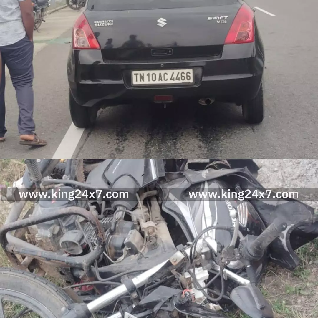 பழனி அருகே பைக் மீது கார் மோதி விபத்து கணவன் - மனைவி படுகாயம்