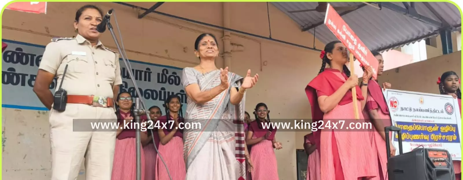 திண்டுக்கல் நகர் DSP.கார்த்திக் அறிவுறுத்தலின் பேரில் தெற்கு காவல் நிலையம் சார்பாக சார்பு ஆய்வாளர் முனியம்மாள் தலைமையில் இந்நிகழ்வில் சார்பு ஆய்வாளர் முனியம்மாள் பள்ளி மாணவியர்களுக்கு போதை பழக்கத்தால், பல்வேறு தீமைகள் ஏற்படுகின்றன. போதை பொருள் விற்பனையை தடுக்க, சட்ட ரீதியான நடவடிக்கை எடுக்கப்பட்டு வருகிறது. சமூகத்தில் பெண்களின் முக்கியத்துவம், உயர்கல்வி மற்றும் காவல்துறையில் பெண்களின் பங்களிப்பு குறித்து விளக்கினார். மேலும், போதை பொருள் பயன்பாட்டை தடுக்க, தங்கள் உறவினர்கள், நண்பர்களிடம் விழிப்புணர்வு ஏற்படுத்த வேண்டும் என்றார். தொடர்ந்து, போக்சோ சட்டம் தொடர்பாக விளக்கம் அளித்ததுடன், பாலியல் ரீதியாக தொந்தரவு செய்பவர்கள் மீது போலீசில் புகார் செய்யலாம் என அறிவுரைகள் வழங்கினார்.