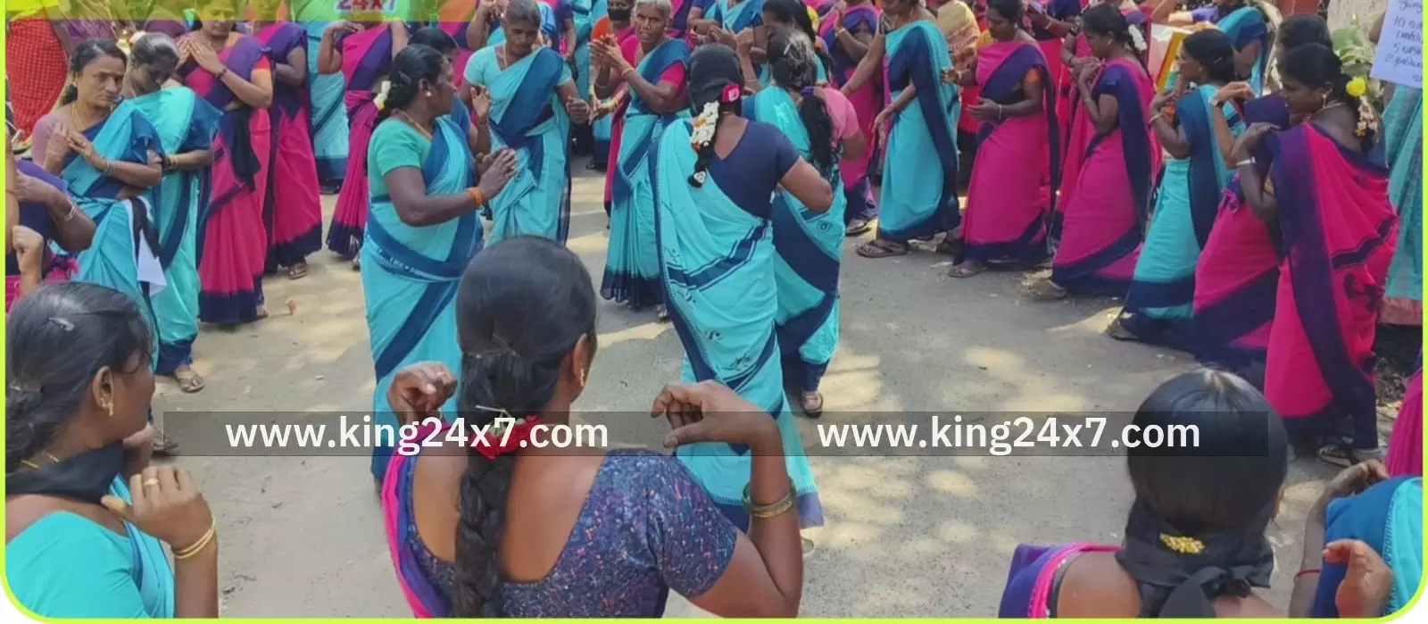 திண்டுக்கல் யூனியன் அலுவலகம் முன்பு தமிழ்நாடு அங்கன்வாடி மற்றும் சத்துணவு சங்கங்களின் கூட்டமைப்பு திண்டுக்கல் மாவட்டம் சார்பாக திமுகவின் தேர்தல் வாக்குறுதி 313-ஐ நிறைவேற்ற வலியுறுத்தியும், உச்ச நீதிமன்றம் தீர்ப்பின் படி பணிக்கொடை ரூ.10 லட்சம் மற்றும் ரூ.5 லட்சம் வழங்க வேண்டும் என்றும், மே மாதம் முழுவதும் விடுமுறை வழங்க வேண்டும் உள்ளிட்ட பல்வேறு கோரிக்கைகளை வலியுறுத்தி தொடர்ந்து 4-வது நாளாக வாயில் கருப்பு துணி கட்டி, காதை பொத்தி, கும்மி அடித்து தொடர் போராட்டத்தில் ஈடுபட்டனர்.