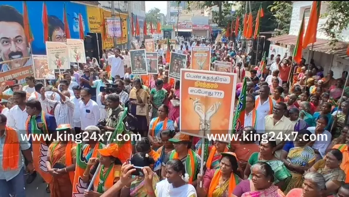 Karur King 24x7 |10 Feb 2026 3:10 PM ISTகரூரில், பெண்களுக்கு எதிராக நடக்கும் அநீதிகளை கண்டித்து பாஜகவினர் கண்டன ஆர்ப்பாட்டம்