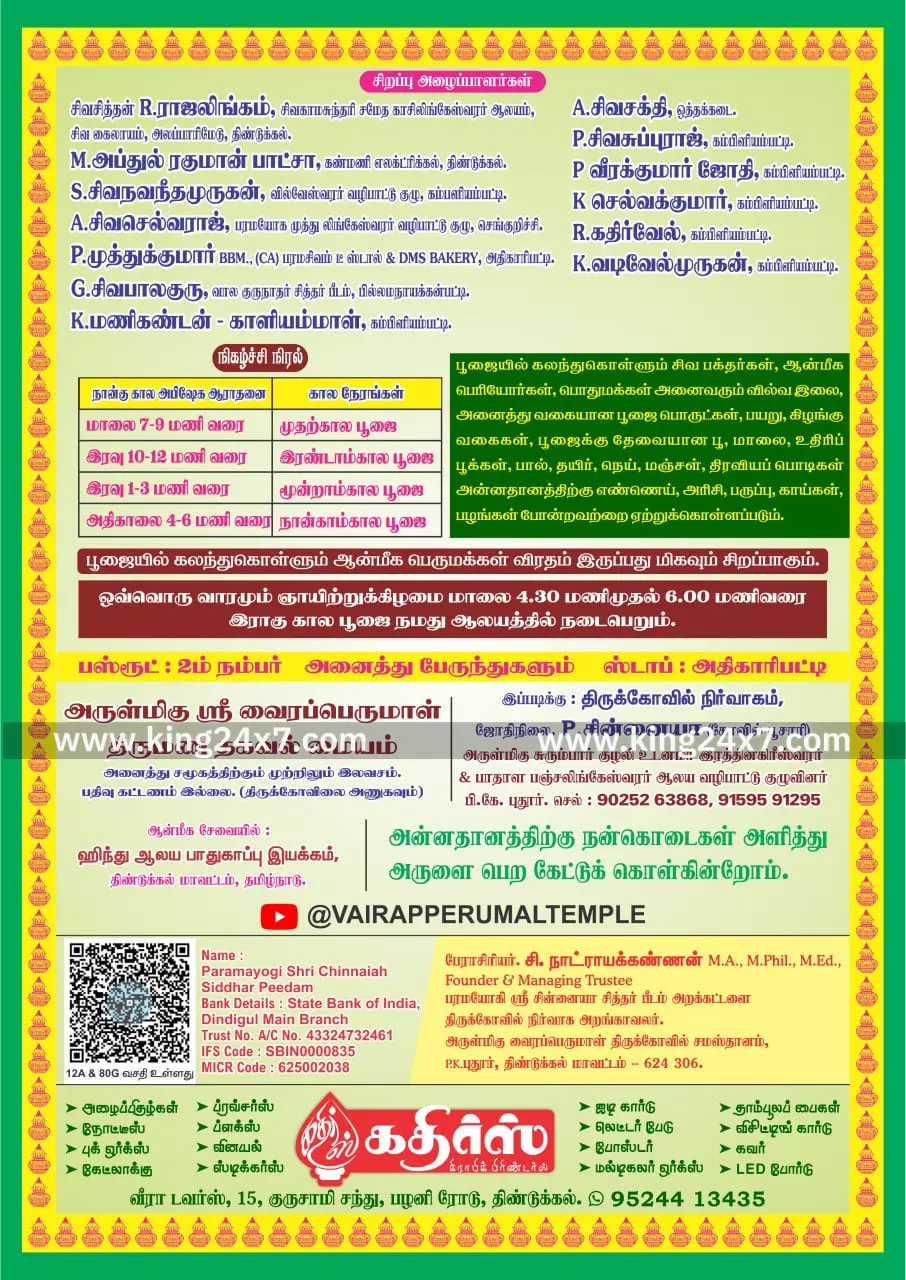 திண்டுக்கல் மாவட்டம் நத்தம் சட்டமன்ற தொகுதி உட்பட்ட சிலுவத்தூர் வங்கமனுத்து கிராமம் பிகே புதூரில் அருள் பாதித்து வரும் ஸ்ரீவைரப் பெருமாள் திருக்கோவிலில் நான்காம் ஆண்டு சிவராத்திரி விழா நடைபெற உள்ளது15.2.2026 அன்று இரவு 7:00 மணி முதல் காலை 6 மணி வரை மகா சிவராத்திரி நடைபெறும் மற்றும் சிறப்பு அபிஷேகமும் அதனைத் தொடர்ந்து அன்னதானமும் வழங்கப்படும் என தெரிவிக்கப்பட்டுள்ளது
