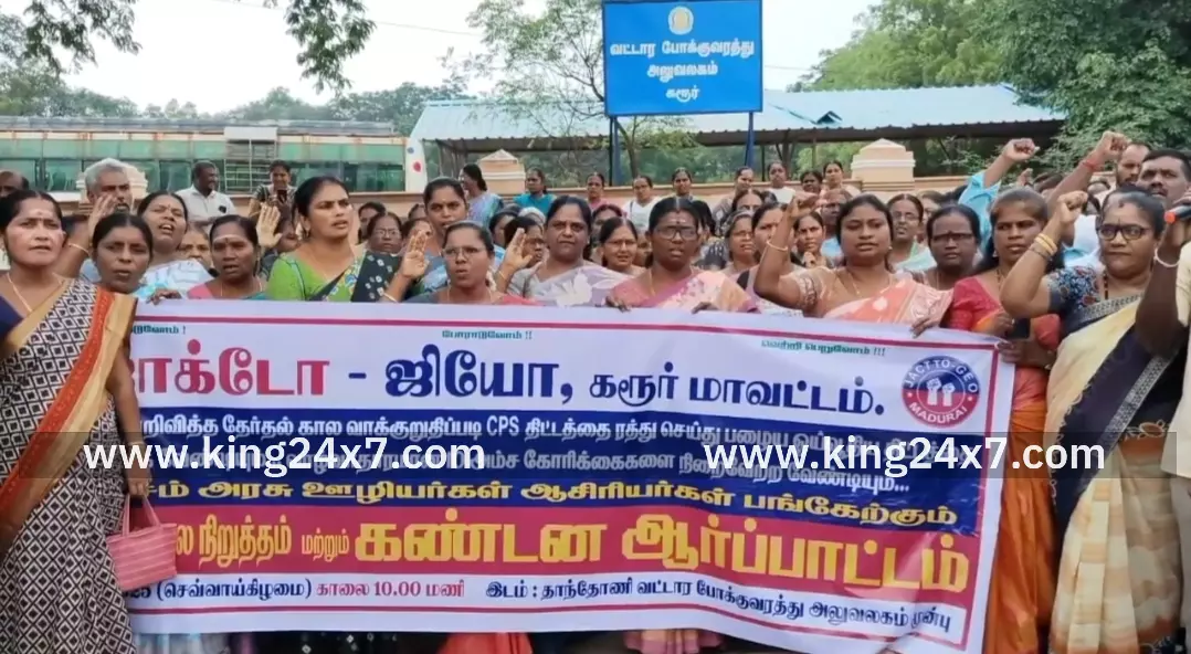 கரூரில் ஜாக்டோ ஜியோ சார்பில் 10 அம்ச கோரிக்கைகளை நிறைவேற்ற வலியுறுத்தி ஒரு நாள் தற்செயல் விடுப்பு எடுத்து ஆர்ப்பாட்டம். தமிழக அரசு அறிவித்த தேர்தல் கால வாக்குறுதிபடி சிபிஎஸ் திட்டத்தை ரத்து செய்து பழைய ஓய்வூதிய திட்டத்தை அறிவிக்க வேண்டிய பல்வேறு வாழ்வாதாரமான 10 அம்ச கோரிக்கை நிறைவேற்ற வலியுறுத்தி இன்று தமிழகம் முழுவதும் அரசு ஊழியர்கள் ஆசிரியர்கள் தற்செயல் ஒருநாள் விடுப்பு எடுத்து அடையாள வேலை நிறுத்த போராட்டத்தில் ஈடுபட்டனர். இதனைத் தொடர்ந்து கரூர் வட்டார போக்குவரத்து அலுவலகம் முன்பு ஜாக்டோ ஜியோ அமைப்பில் உள்ள தமிழ்நாடு அரசு ஊழியர் சங்க மாவட்ட தலைவர் அன்பழகன், தமிழ்நாடு ஆசிரியர் கூட்டணி மாநில பொருளாளர் பெரியசாமி,அரசு ஊழியர் சங்க மாவட்ட செயலாளர் ஜெயராம் ஆகியோர் தலைமையில் கோரிக்கைகளை வலியுறுத்தி ஆர்ப்பாட்டம் நடைபெற்றது. இந்த ஆர்ப்பாட்டத்தில் தமிழ்நாடு தொடக்க கல்வி ஆசிரியர் மன்ற மாவட்ட செயலாளர் வேலுமணி,தமிழ்நாடு இடைநிலை ஆசிரியர் சங்க மாவட்ட செயலாளர் ஆரோக்கிய பிரேம்குமார்,தமிழக ஆரம்ப பள்ளி ஆசிரியர் மாவட்ட செயலாளர் செல்வதுரை உள்ளிட்ட சங்க நிர்வாகிகள் மற்றும் அரசு ஊழியர்கள் ஆசிரியர்கள் என சுமார் 300க்கும் மேற்பட்டோர் கலந்து கொண்டு தங்களது கோரிக்கைகளை வலியுறுத்தி ஆர்ப்பாட்டத்தில் ஈடுபட்டனர். அப்போது கடந்த 2003-ம் ஆண்டுக்கு பிறகு அரசு பணியில் சேர்ந்தவர்களுக்கு தற்போது நடைமுறைப்படுத்தப்பட்டு வரும் பங்களிப்புடன் கூடிய ஓய்வூதிய திட்டத்தினை கைவிட்டு பழைய ஓய்வூதிய திட்டத்தினை அமுல்படுத்த வேண்டும். தொடக்க கல்வி துறையில் பணிபுரியும் 90% மேற்பட்ட ஆசிரியர்களுக்கு பாதிப்பினை ஏற்படுத்தியுள்ள அரசாணை 243 உடனடியாக ரத்து செய்ய வேண்டும். அரசின் பல்வேறு துறைகளில் 30 சதவீதத்திற்கும் மேலாக காலியாக உள்ள பணியிடங்களை நிரப்பி விடுவதற்கான நடவடிக்கைகளை உடனடியாக மேற்கொள்ள வேண்டும். 21 மாத ஊதிய மாற்ற நிலுவைத் தொகை ஆசிரியர்கள் அரசு ஊழியர்கள் அரசு பணியாளர்கள் ஆகியோருக்கு மறுக்கப்பட்டுள்ளதை வழங்கிட வேண்டும் உள்ளிட்ட 10- அம்ச கோரிக்கைகளை வலியுறுத்தி கோஷங்களை எழுப்பினர்.