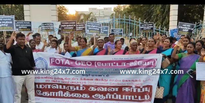 கரூரில் 10-அம்ச கோரிக்கைகளை வலியுறுத்தி போட்டோ-ஜியோ அமைப்பின் சார்பில் கோரிக்கை ஆர்ப்பாட்டம். தமிழ்நாடு அனைத்து அரசு அலுவலர்கள் ஆசிரியர்கள் மற்றும் உள்ளாட்சி பணியாளர்கள் அடங்கிய கூட்டமைப்பு ஆன போட்டோ- ஜியோ சார்பில் 10-அம்ச கோரிக்கைகளை வலியுறுத்தி நேற்று மாலை மாவட்ட ஆட்சியர் அலுவலகம் முன்பு தமிழ்நாடு அரசு ஊழியர் ஒன்றியத்தின் மாவட்டத் தலைவர் பாரதிதாசன், தமிழ்நாடு உயர்நிலை மேல்நிலை பள்ளி பட்டதாரி ஆசிரியர் சங்க மாநில செயலாளர் சந்திரசேகர், தமிழ்நாடு தொடக்கப்பள்ளி ஆசிரியர் கூட்டணியின் மாவட்ட செயலாளர் மணிகண்டன் ஆகியோர் தலைமையில் நடைபெற்ற இந்த கோரிக்கை ஆர்ப்பாட்டத்தில் நூற்றுக்கும் மேற்பட்ட பல்வேறு அரசு ஊழியர் சங்கத்தைச் சேர்ந்த நிர்வாகிகள் ஊழியர்கள் கலந்து கொண்டு தங்களது கோரிக்கையை வலியுறுத்தி ஆர்ப்பாட்டத்தில் ஈடுபட்டனர். அப்போது பங்களிப்பு ஓய்வூதிய திட்டத்தினை ரத்து செய்ய வலியுறுத்தியும், கருணை அடிப்படையில் 5% நியமனம் செய்யக்கூடாது என்பதை ரத்து செய்திட வலியுறுத்தியும், தலைமைச் செயலாகம் முதல் அனைத்து துறைகளிலும் உள்ள பல பிரிவு காலிப் பணியிடங்களை நிரப்பி, பதவி உயர்வு வழங்க வேண்டும் எனவும், அனைத்து அரசு அலுவலர்கள் ஆசிரியர்களுக்கு பழைய நிலையிலேயே உயர் கல்வி ஊக்க ஊதியம் வழங்க வேண்டும் எனவும், மாநில முன்னுரிமை எனக்கூறி வெளியிட்டுள்ள அரசாணை எண் 243 திருத்தம் செய்து மாவட்ட அளவில் முன்னுரிமை வழங்க வேண்டும் என்பது உள்ளிட்ட 10 அம்ச கோரிக்கைகளை வலியுறுத்தி ஆர்ப்பாட்டத்தில் ஈடுபட்டனர்.