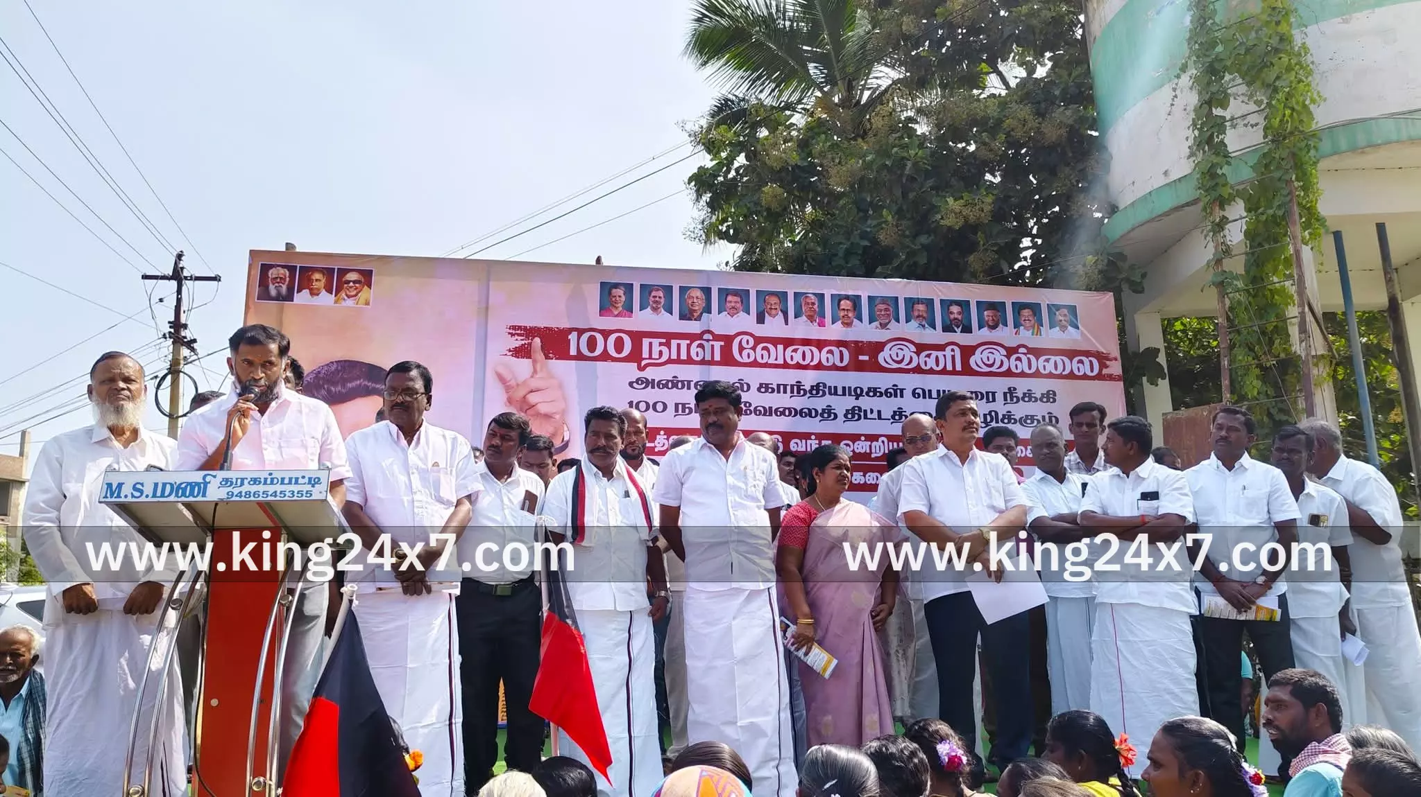 கடவூர் ஊராட்சி ஒன்றிய அலுவலகம் அருகே திமுக சார்பில் 100 நாள் வேலை திட்டத்தினை பெயர் மாற்றி நிறுத்த துடிக்கும் ஒன்றிய அரசை கண்டித்து ஆர்ப்பாட்டம்