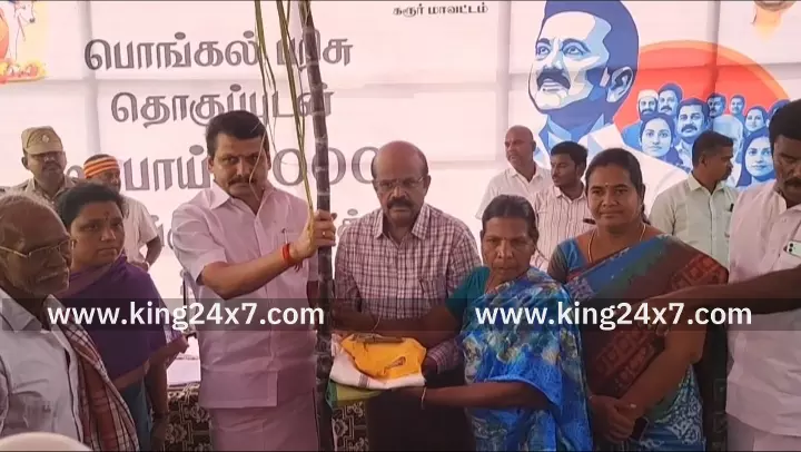 Karur King 24x7 |8 Jan 2026 7:34 PM ISTகரூரில் தமிழர் திருநாள் தைப்பொங்கல் விழாவை சிறப்பாக கொண்டாடும் விதமாக ரூ. 3,000 ரொக்கத் தொகையுடன் கூடிய பொங்கல் பரிசு தொகுப்பினை முன்னாள் அமைச்சர் செந்தில்பாலாஜி பயனாளிகளுக்கு வழங்கினார்.
