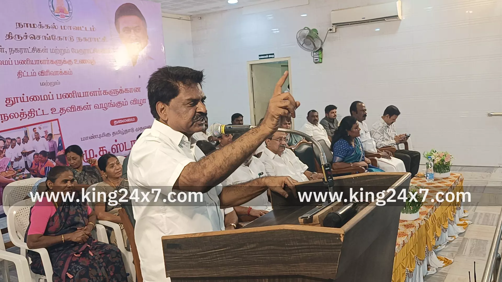 நாமக்கல் மாவட்டம் திருச்செங்கோடு நகராட்சியில் உள்ள 348 தூய்மை பணியாளர்களுக்கு காலை உணவுத் திட்டம் விரிவாக்கம் மற்றும் தூய்மைப் பணியாளர்களுக்கான நலத்திட்ட உதவிகள் வழங்கும் விழா நிகழ்ச்சியை தமிழ்நாடு முதலமைச்சர் ஸ்டாலின் காணொளி காட்சி மூலம் துவக்கி வைத்தார். திருச்செங்கோடு வேலூர் ரோடு கொங்கு வேளாளர் திருமண மண்டபத்தில் நடைபெற்ற நிகழ்ச்சியில் திருச்செங்கோடு சட்டமன்ற உறுப்பினர் ஈஸ்வரன், நகர்மன்றத் தலைவர் நளினி சுரேஷ்பாபு, நகராட்சி ஆணையாளர் வாசுதேவன் உள்ளிட்ட பலரும் கலந்து கொண்டனர் தமிழக முழுவதும் தூய்மை பணியாளர்களுக்கு காலை உணவு திட்டம் தொடங்கப்பட்டு தற்போது அது விரிவாக்கம் செய்யப் பட்டுள்ளது. அதன்படி திருச்செங்கோடு நகராட்சியில் 348 தூய்மை பணியாளர்கள், டிபிசி பணியாளர்கள்,ஓட்டுனர்கள் ஆகியோருக்கும் காலைஉணவு திட்டம் விரிவாக்கம் செய்து வழங்கப்பட உள்ளது இதற்கான துவக்க விழா நிகழ்ச்சி வேலூர் ரோடு கொங்கு வேளாளர் திருமண மண்டபத்தில் நடைபெற்றது. திருவள்ளூர் மாவட்டத்தில் தமிழ்நாடு முதலமைச்சர் ஸ்டாலின் காணொளிக் கட்சி மூலமாக தொடங்கி வைத்த நிகழ்ச்சியை தொடர்ந்து சட்டமன்ற உறுப்பினர் ஈஸ்வரன்நாமக்கல் மேற்கு மாவட்ட திமுக செயலாளர் பரமத்தி முன்னாள் சட்டமன்ற உறுப்பினர் கே.எஸ்.மூர்த்தி நகர மன்ற தலைவர் நளினி சுரேஷ் பாபு,நகராட்சி ஆணையாளர் வாசுதேவன்ஆகியோர் கலந்து கொண்டு துவக்கி வைத்தனர். நிகழ்ச்சியில் முன்னாள் நகர் மன்ற தலைவர் மேற்கு நகர திமுக செயலாளர் நடேசன், நகர்மன்ற துணைத் தலைவர்கிழக்கு நகர திமுக செயலாளர் கார்த்திகேயன், நகர் மன்ற உறுப்பினர்கள் மகேஸ்வரி, சம்பூர்ணம், சினேகாஹரிஹரன், செல்லம்மாள் தேவராஜன், செல்வி ராஜவேல், அசோக்குமார், மனோன்மணி சரவணன் முருகன்,எஸ் ரமேஷ் திவ்யா வெங்கடேஸ்வரன் முருகேசன், அண்ணாமலை, ராஜா,நாமக்கல் மேற்கு மாவட்ட திமுக வழக்கறிஞர் அணி தலைவர் சுரேஷ்பாபு கொங்குநாடு மக்கள் தேசிய கட்சி மாவட்டசெயலாளர் ராயல் செந்தில், இணை செயலாளர் லாவண்யா ரவி அமைப்பு செயலாளர் நந்தகுமார் நகரச் செயலாளர் சேன்யோகுமார்,விளையாட்டு மேம்பாட்டு அணி செயலாளர் வெற்றி செந்தில்,ஆகியோர் உள்ளிட்ட பலரும் கலந்து கொண்டனர் நிகழ்ச்சியில் பேசிய சட்டமன்ற உறுப்பினர் ஈஸ்வரன் கூறியதாவது திருச்செங்கோட்டிலஅதிகமான வாக்குகளை வரும் சட்டமன்றத் தேர்தலில் திமுக கூட்டணி பெறுகிறது என்றால் அதற்கு முழு காரணமாக இருப்பவர்கள் தூய்மை பணியாளர்கள் தான் தூய்மை காவலர்களான நீங்கள் செய்யும் பணியாள்தான் நகர் மன்றம் சிறப்பு நிலை நகராட்சி என்கிற உயரத்தை எட்டி இருக்கிறது.முன்னாள் சட்டமன்ற உறுப்பினர் 14 முறை தான் பேசியுள்ளார்.உங்